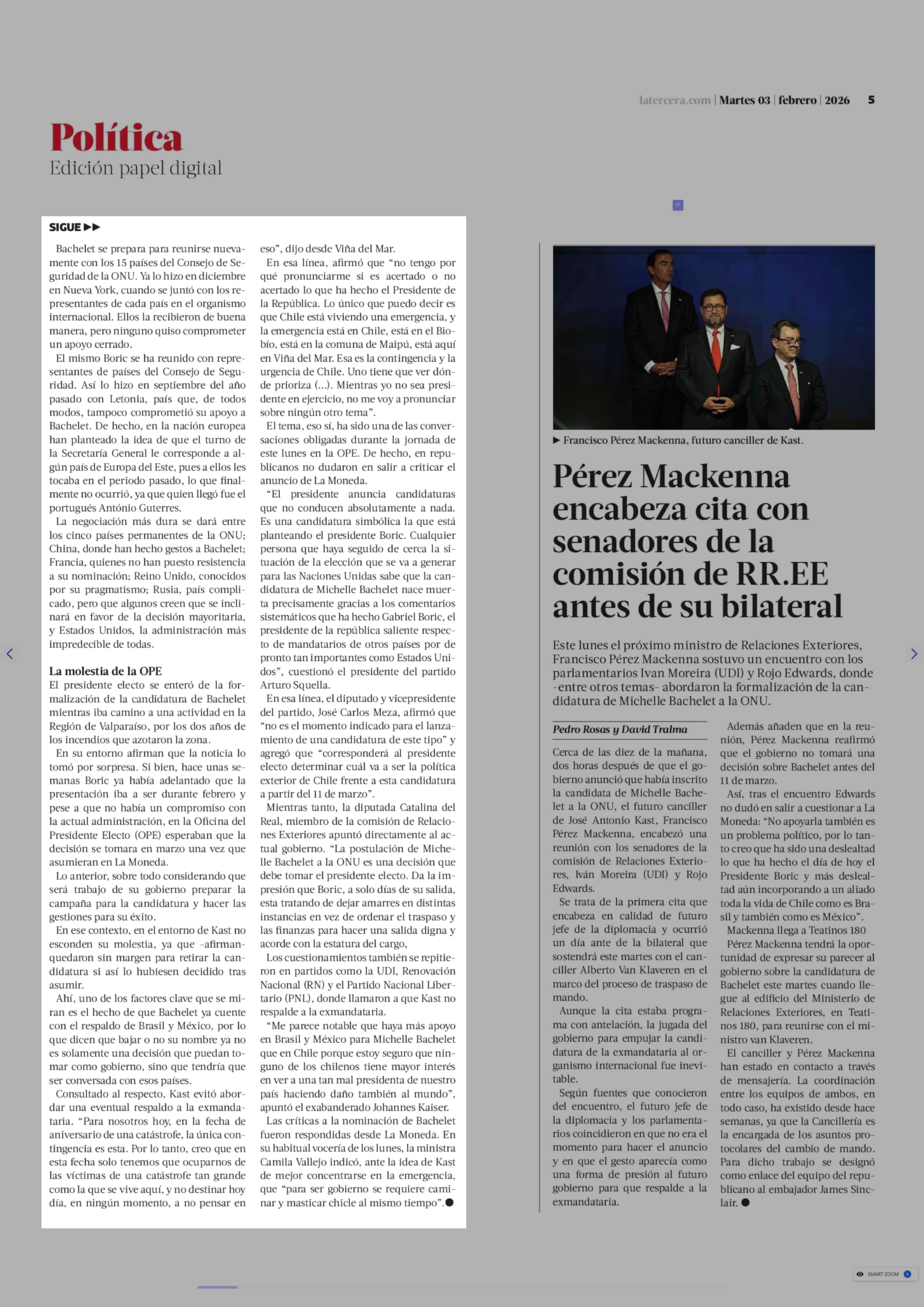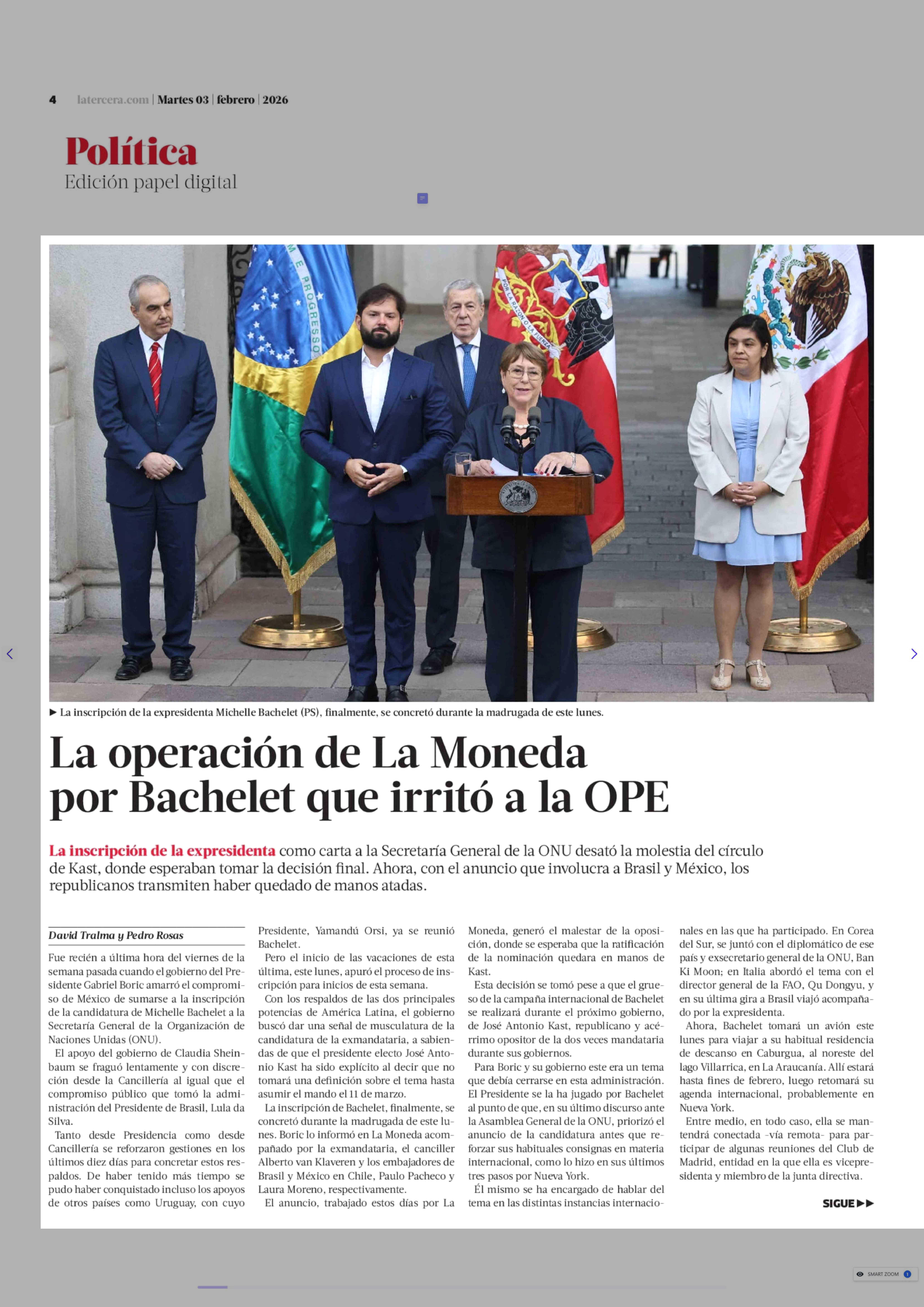 La operación de La Moneda por Bachelet que irritó a la OPE 03-02-2026 La Tercera |
