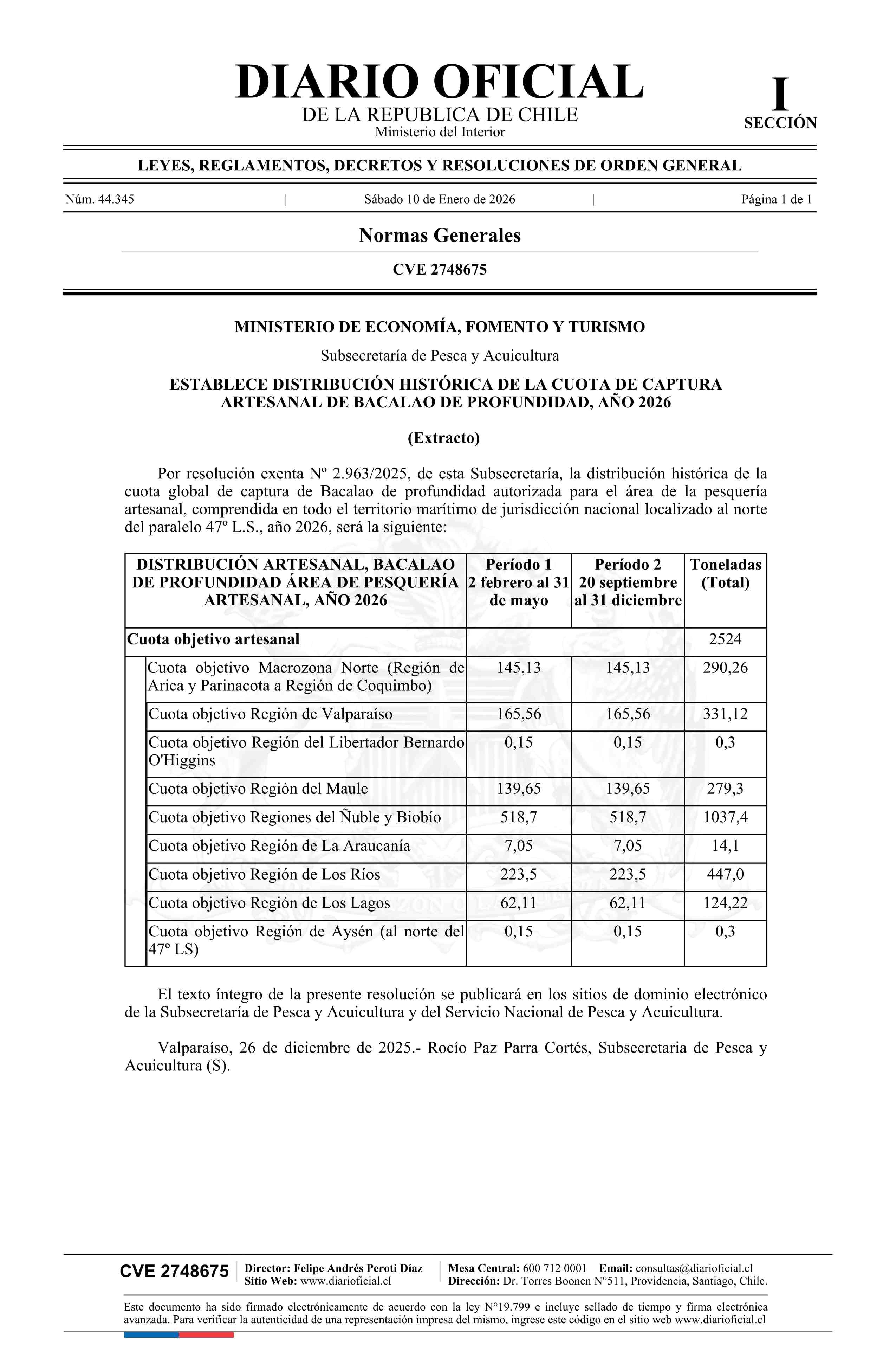 Extracto de resolución exenta número 2.963, de 2025.- Establece distribución histórica de la cuota de captura artesanal de Bacalao de profundidad, año 2026 10-01-2026 Diario Oficial Edición Electrónica |