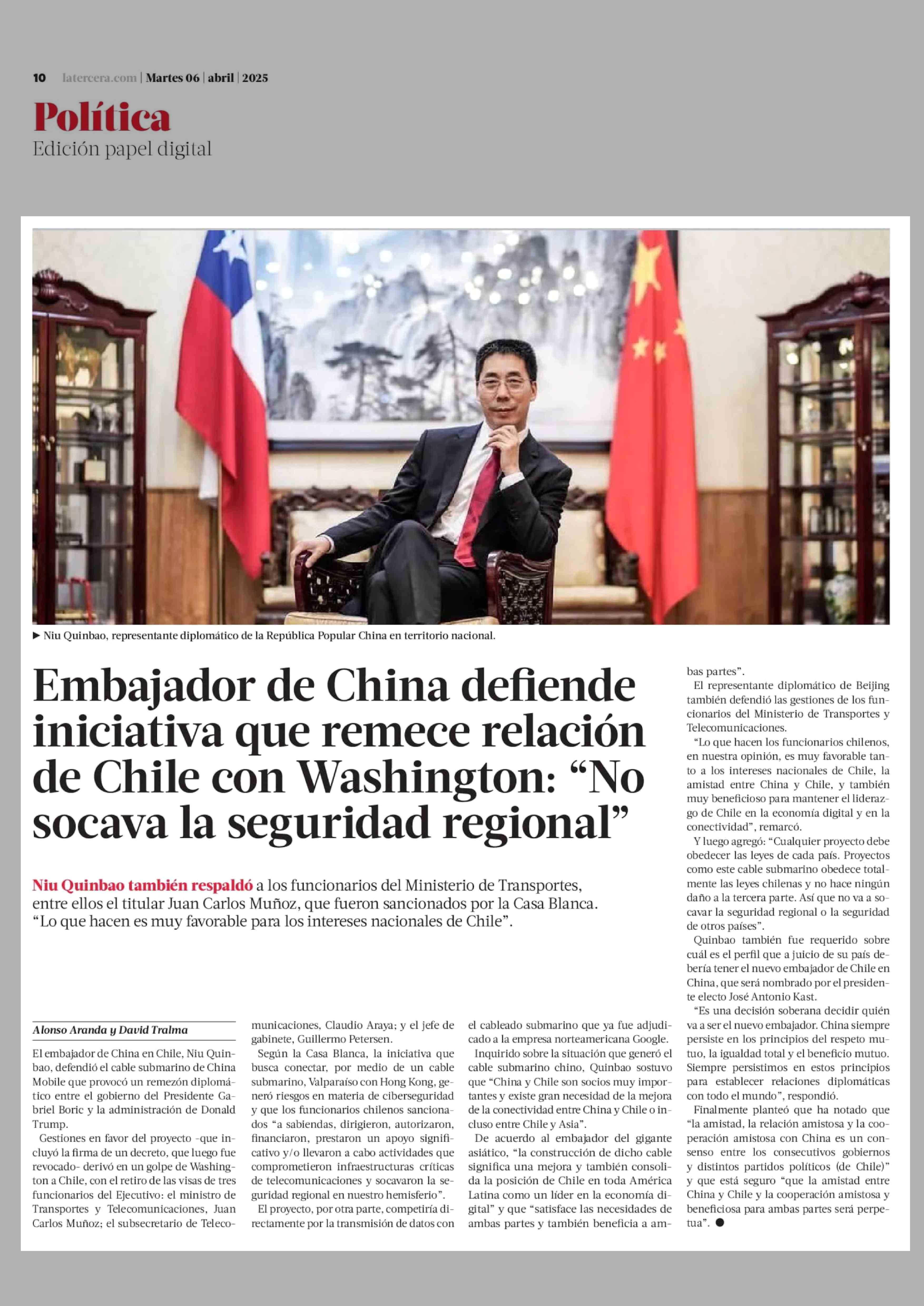 Título: Embajador de China defiende iniciativa que remece relación de Chile con Washington: "No socava la seguridad regional"