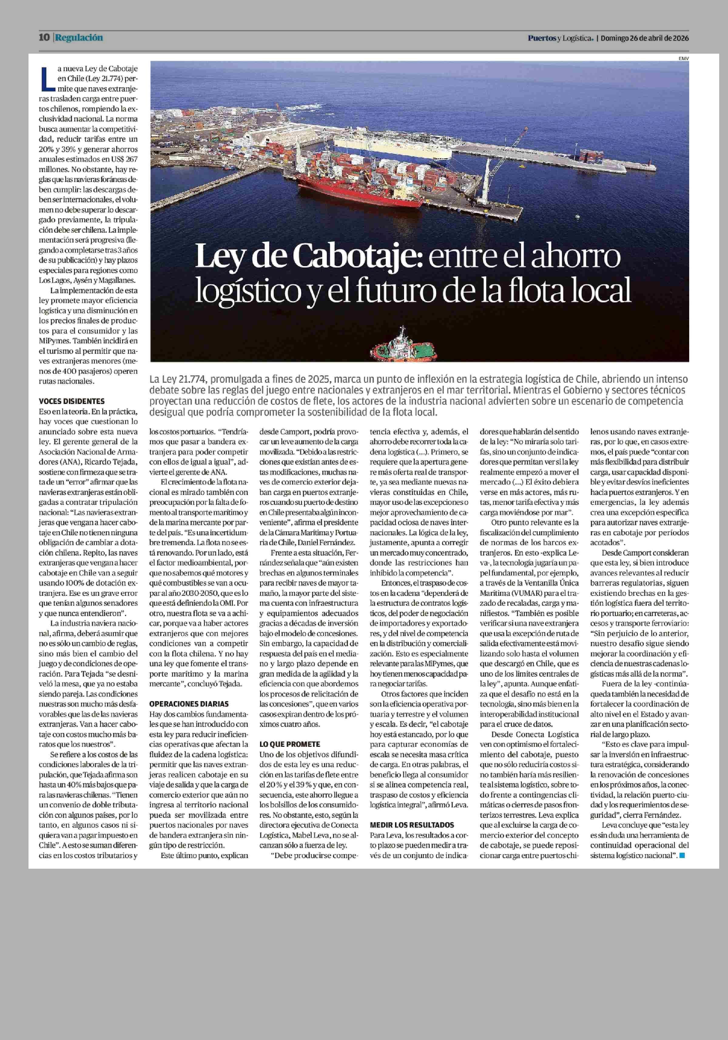 Ley de Cabotaje: entre el ahorro logístico y el futuro de la flota local 26-04-2026 El Mercurio de Valparaíso |