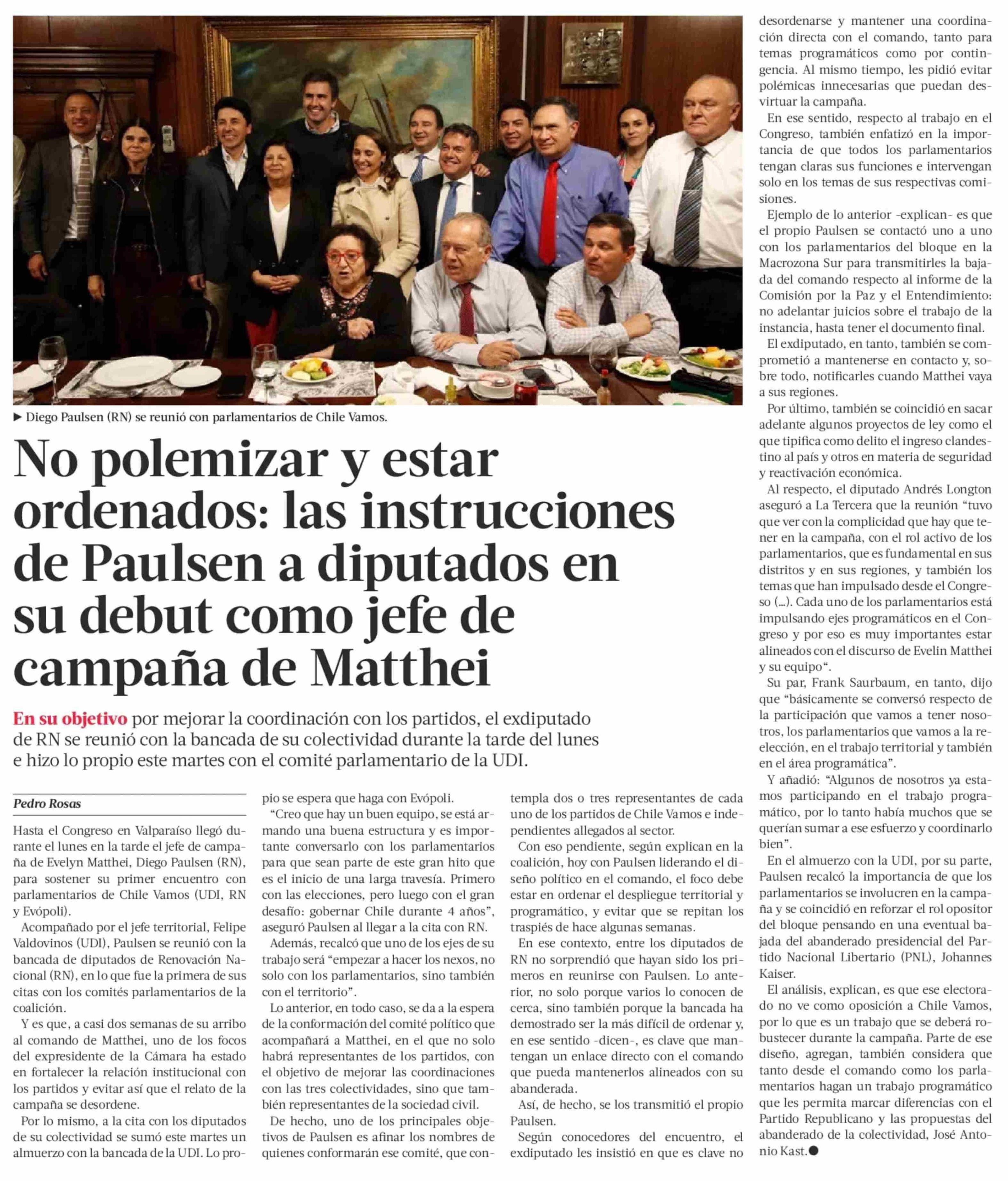 | Título: | No polemizar y estar ordenados: las instrucciones de Paulsen a diputados en su debut como jefe de campaña de Matthei |