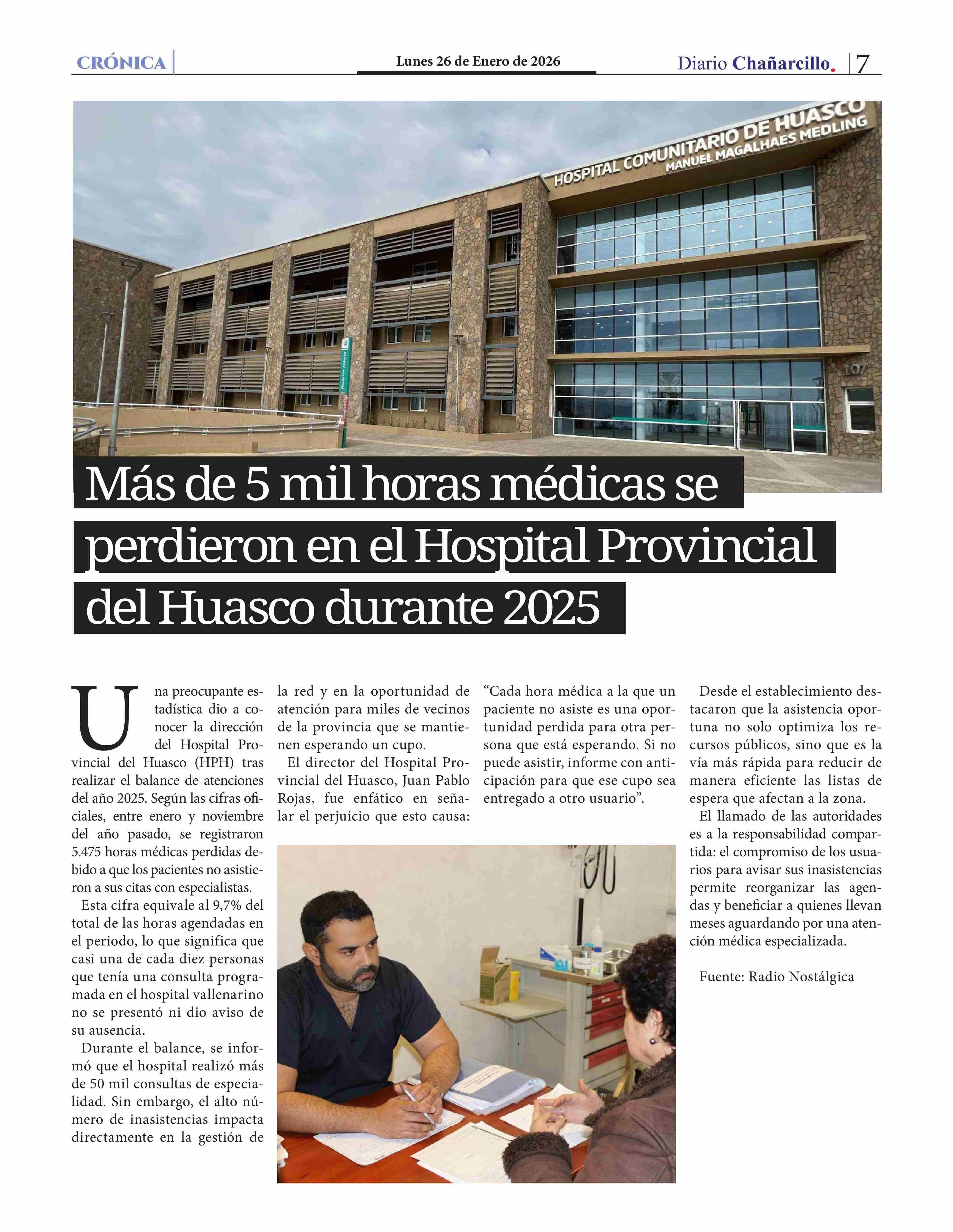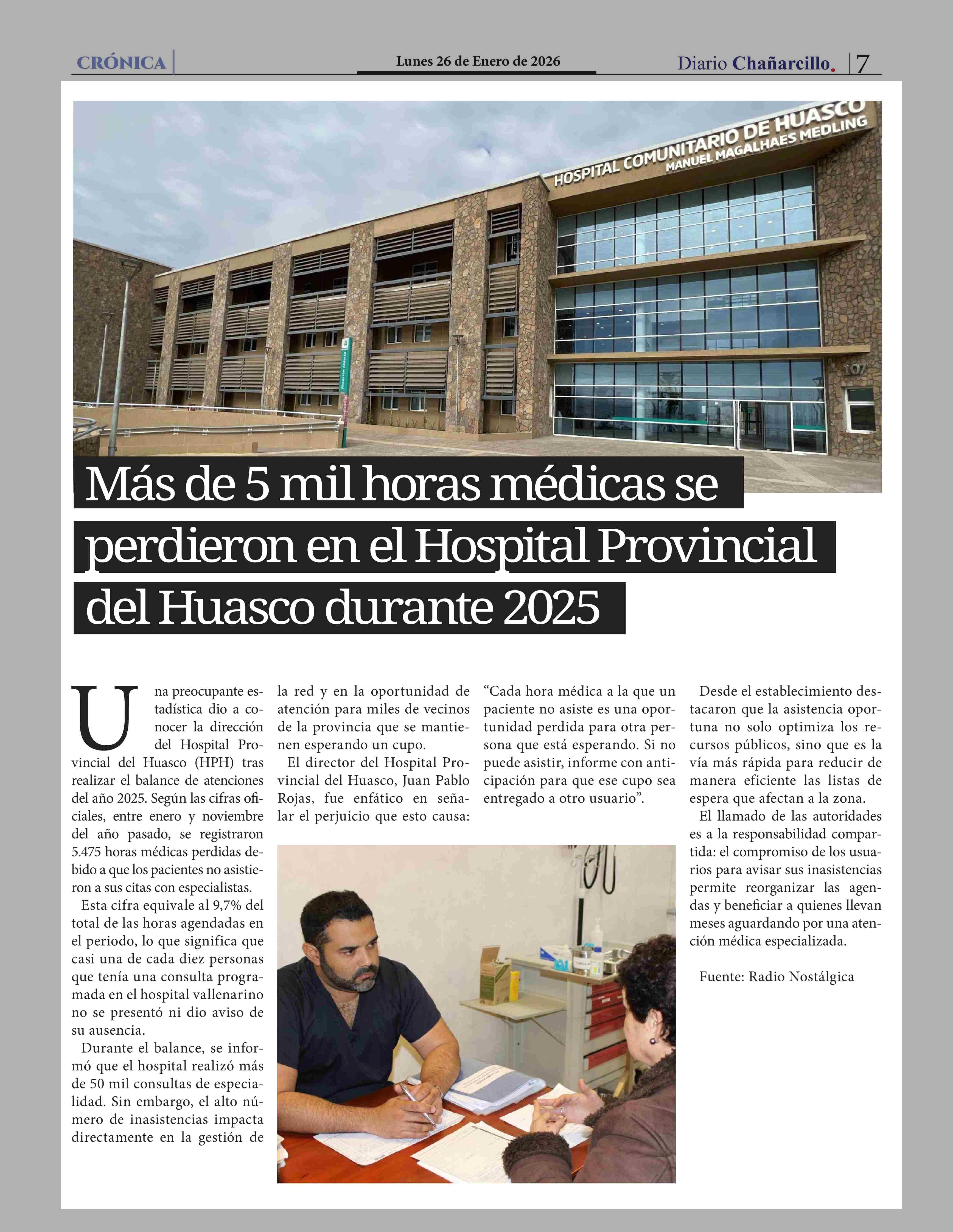 Más de 5 mil horas médicas se perdieron en el Hospital Provincial del Huasco durante 2025 26-01-2026 Diario Chañarcillo |
