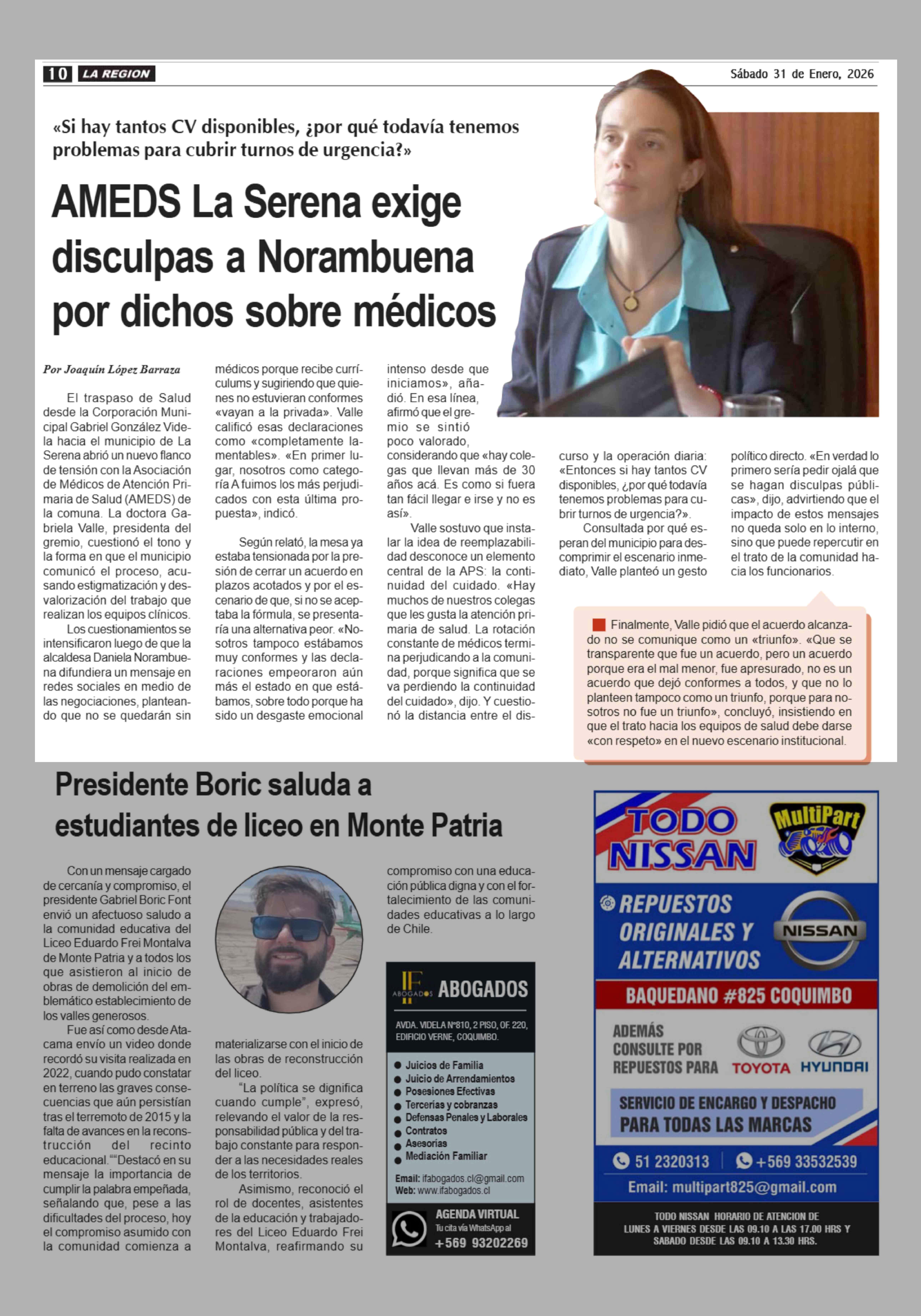 AMEDS La Serena exige disculpas a Norambuena por dichos sobre médicos 31-01-2026 Diario la Región |
