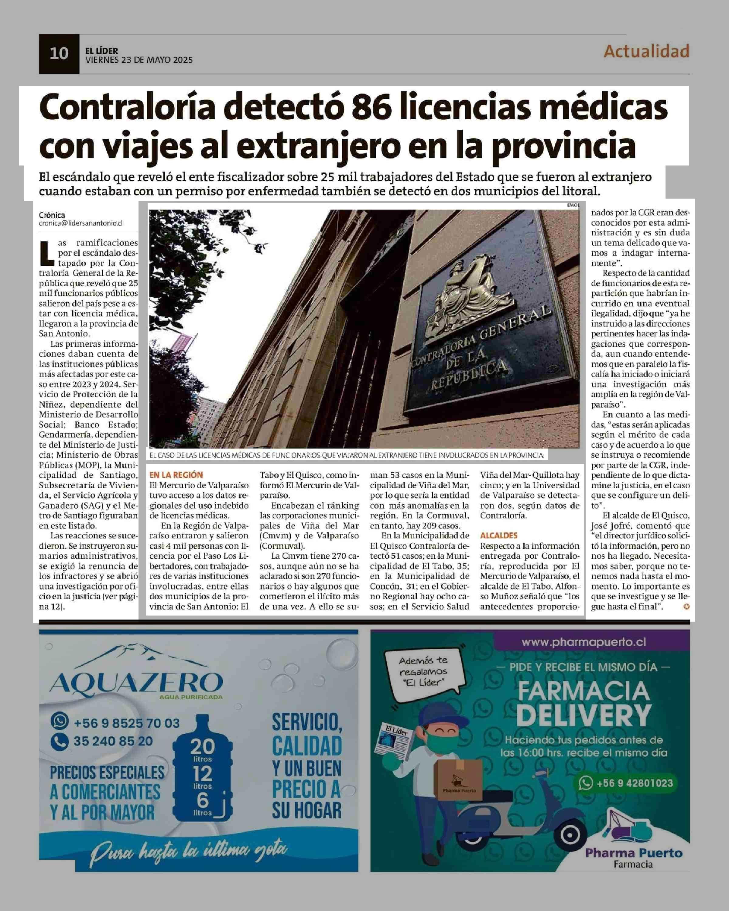 Contraloría detectó 86 licencias médicas con viajes al extranjero en la provincia 23-05-2025 El Líder |