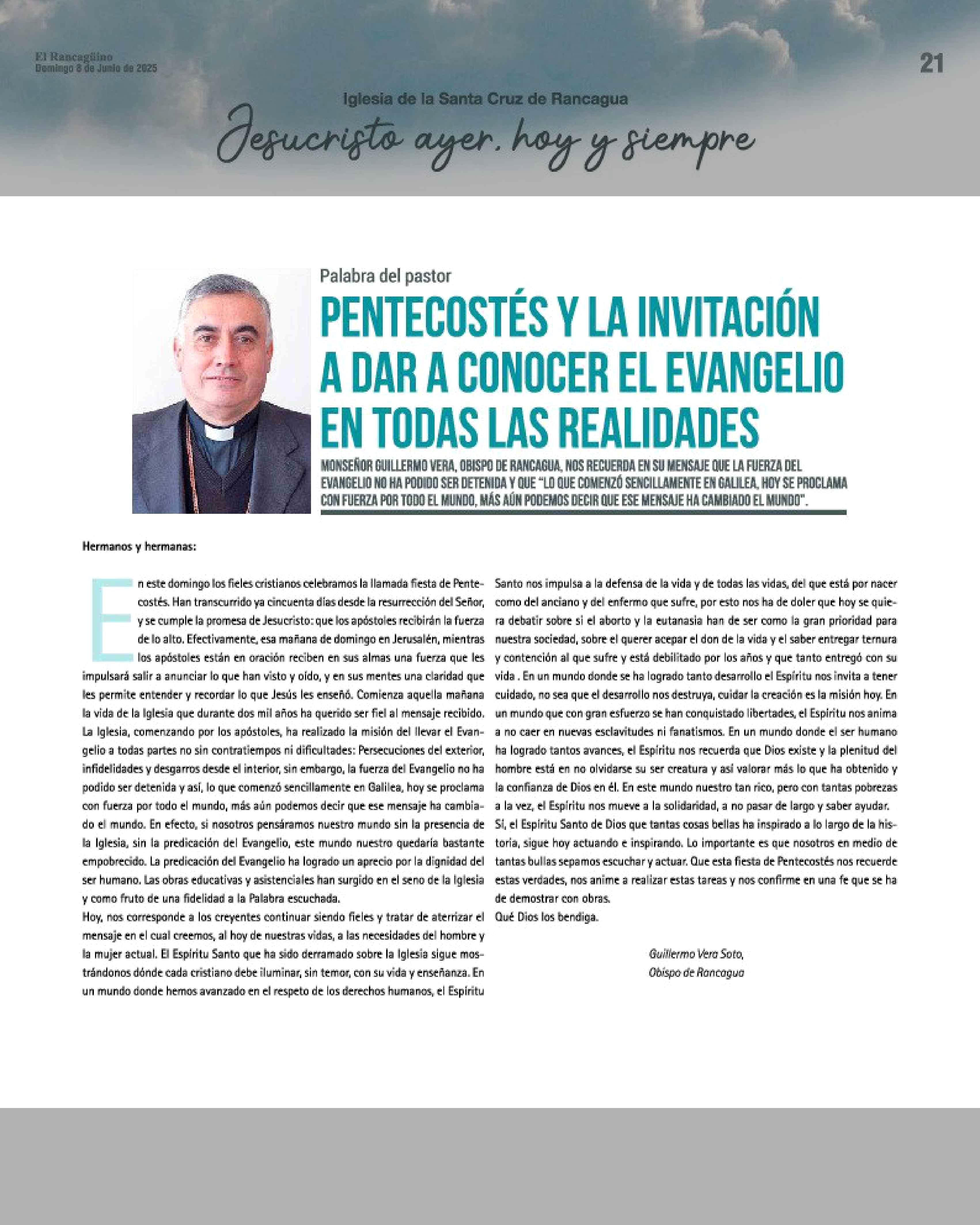 PENTECOSTÉS Y LA INVITACIÓN A DAR A CONOCER EL EVANGELIO EN TODAS LAS REALIDADES 08-06-2025 El Rancagüino |