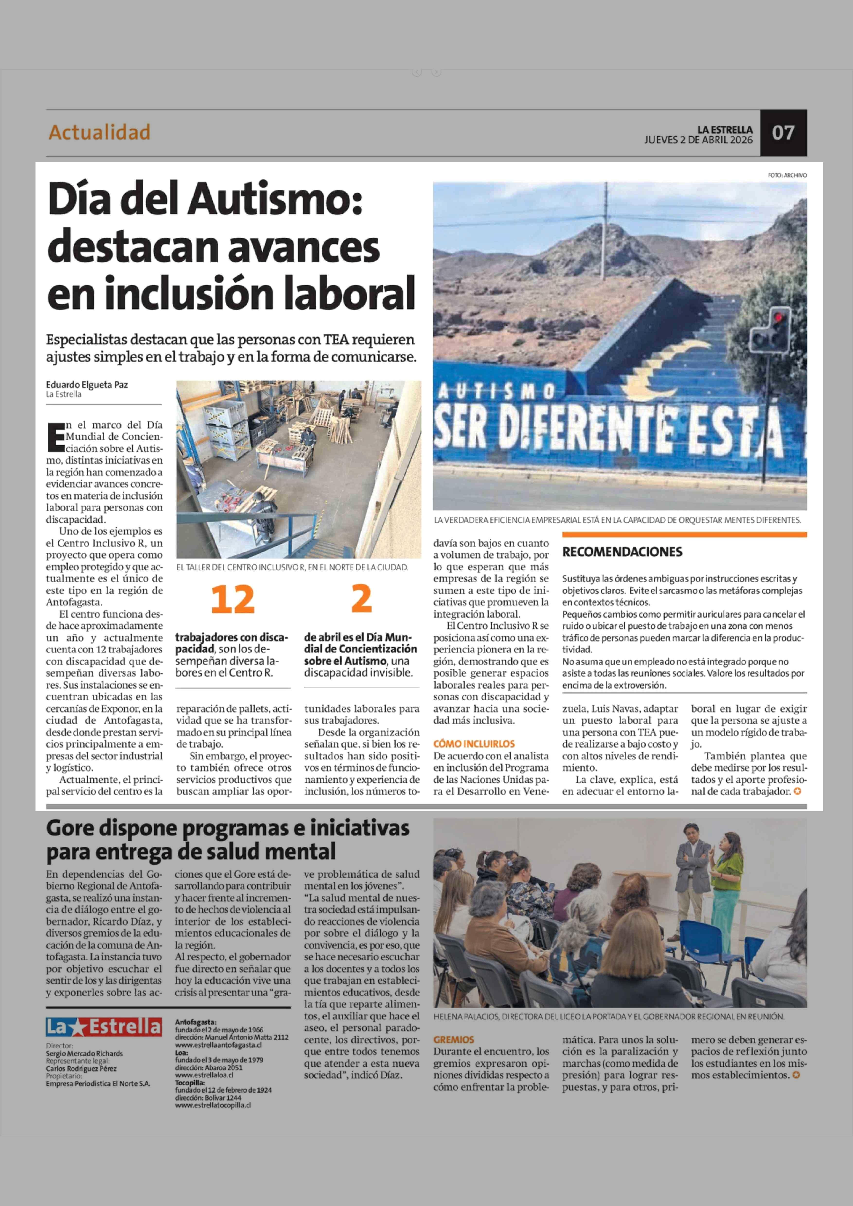 Día del Autismo: destacan avances en inclusión laboral 02-04-2026 La Estrella de Antofagasta |