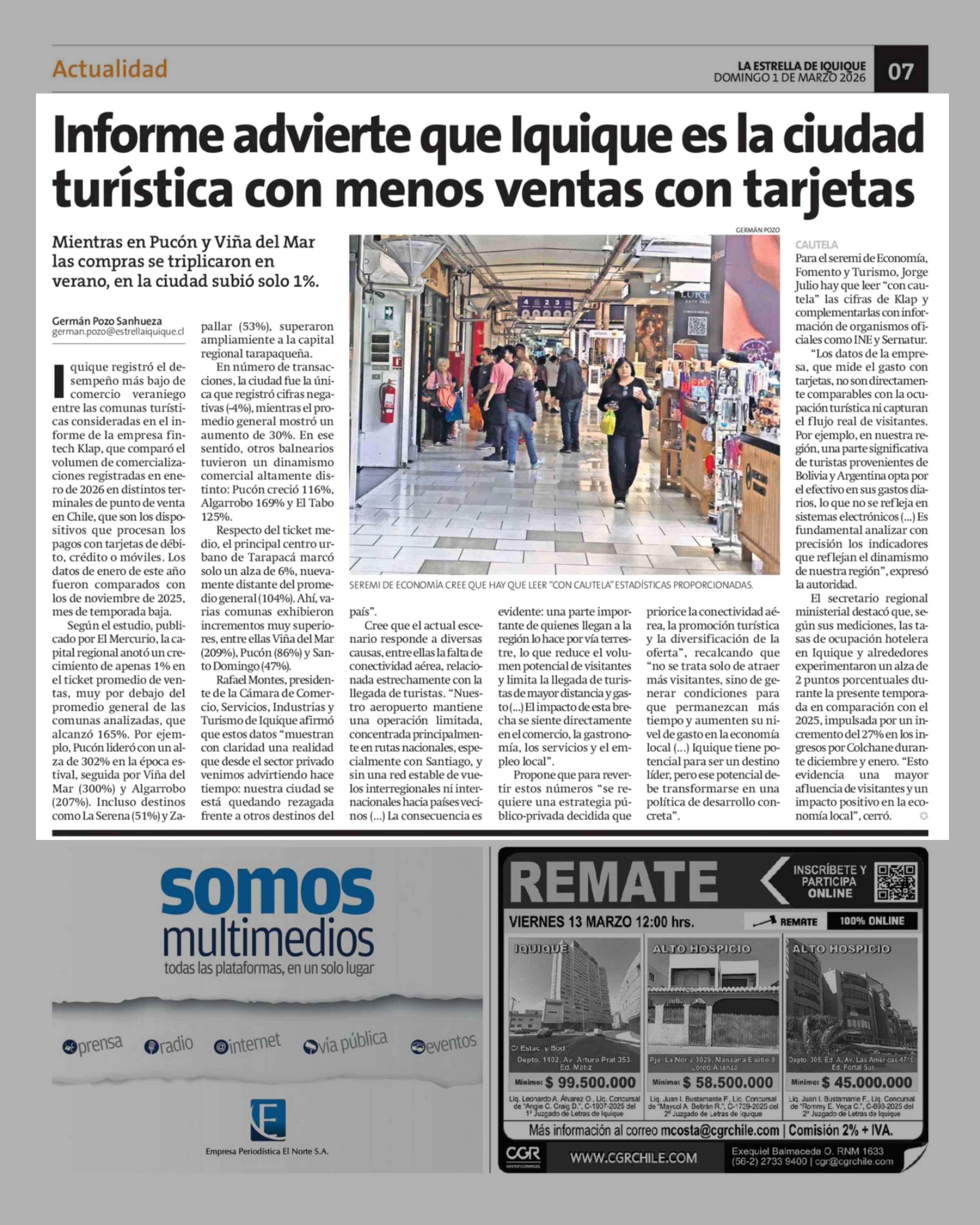 Informe advierte que Iquique es la ciudad turística con menos ventas con tarjetas 01-03-2026 La Estrella de Iquique |