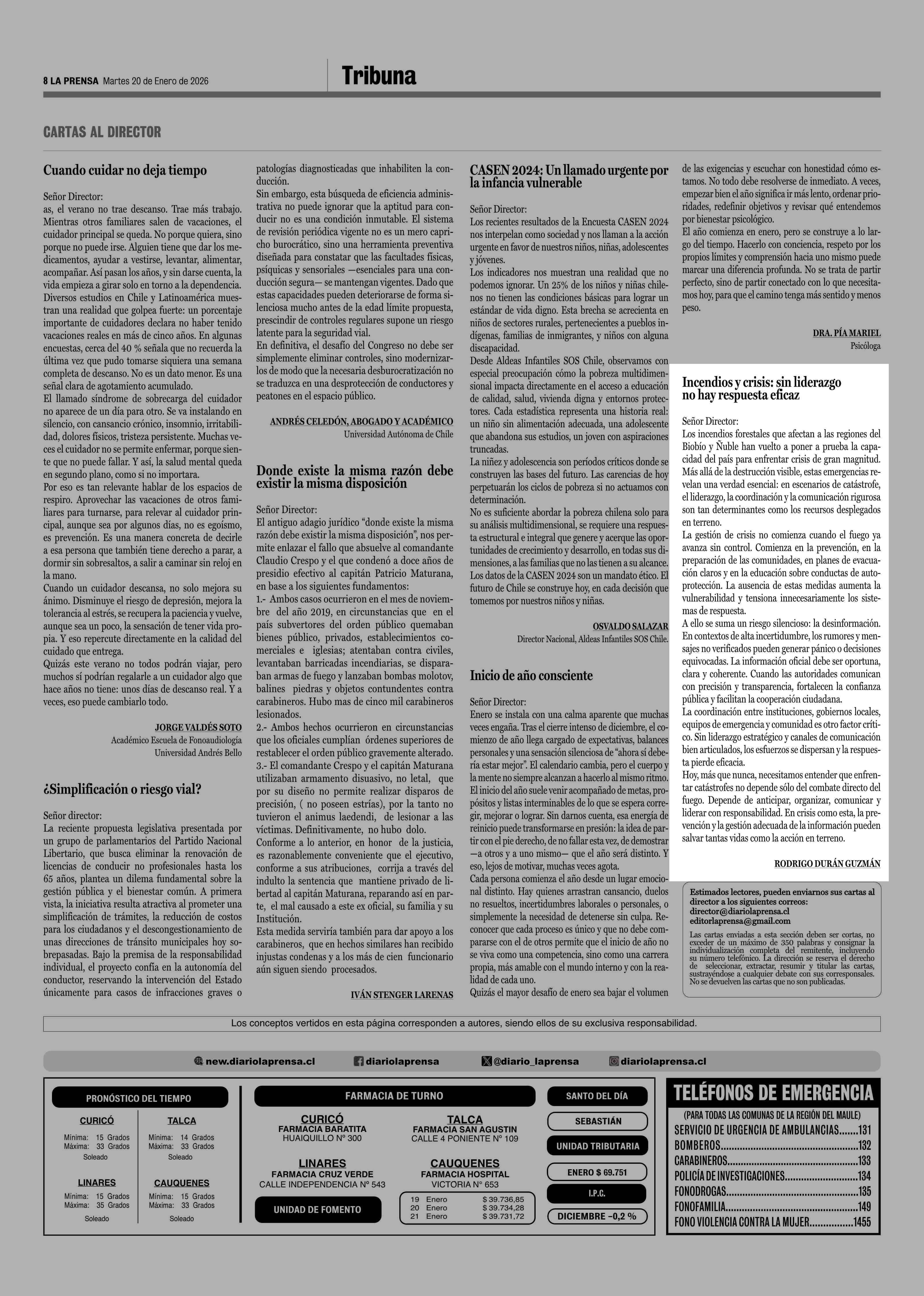 Cartas: Incendios y crisis: sin liderazgo no hay respuesta eficaz 20-01-2026 La Prensa de Curicó |