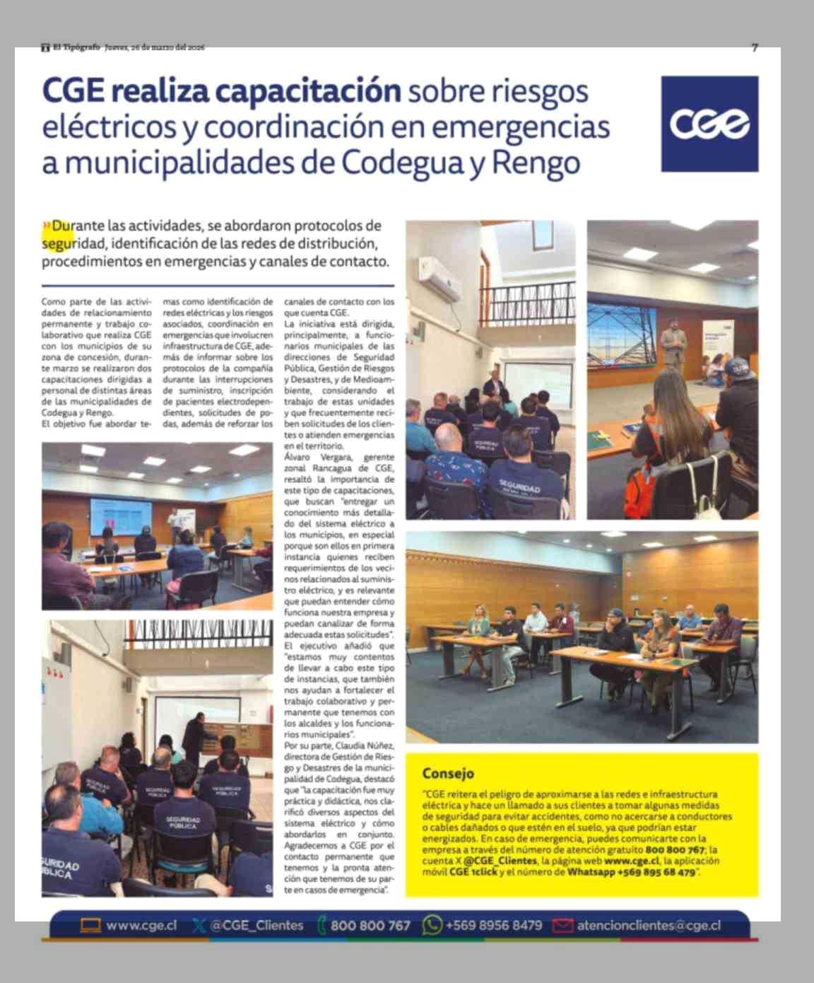 CGE realiza capacitación sobre riesgos eléctricos y coordinación en emergencias a municipalidades de Codegua y Rengo 26-03-2026 El Tipógrafo |