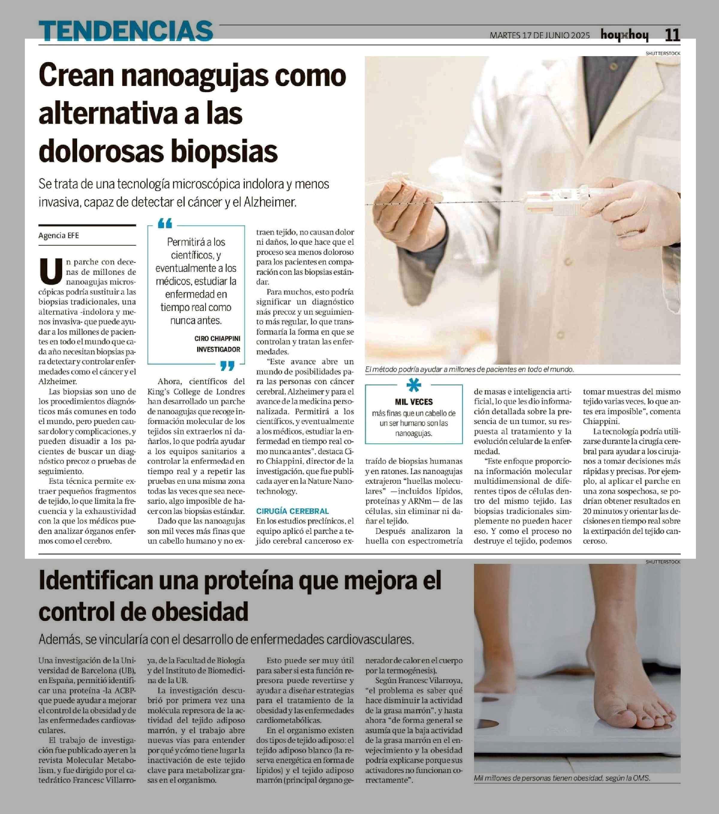 Crean nanoagujas como dolorosas biopsias alternativa a las 17-06-2025 Hoy x Hoy Concepción |