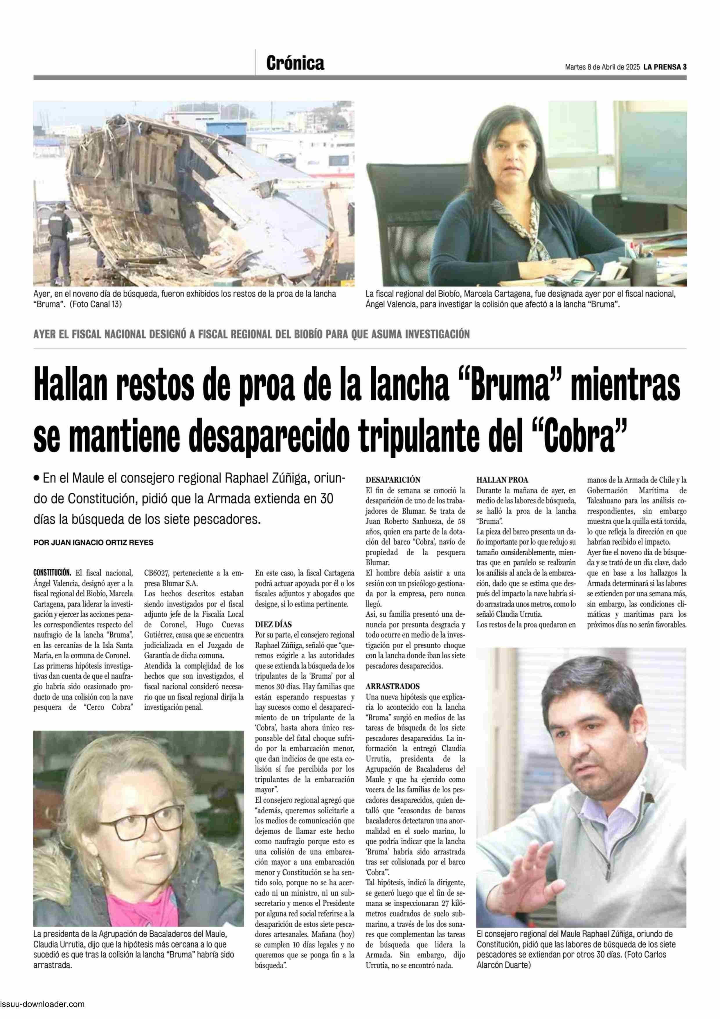 Hallan restos de proa de la lancha “Bruma” mientras se mantiene desaparecido tripulante del “Cobra" 08-04-2025 La Prensa de Curicó |