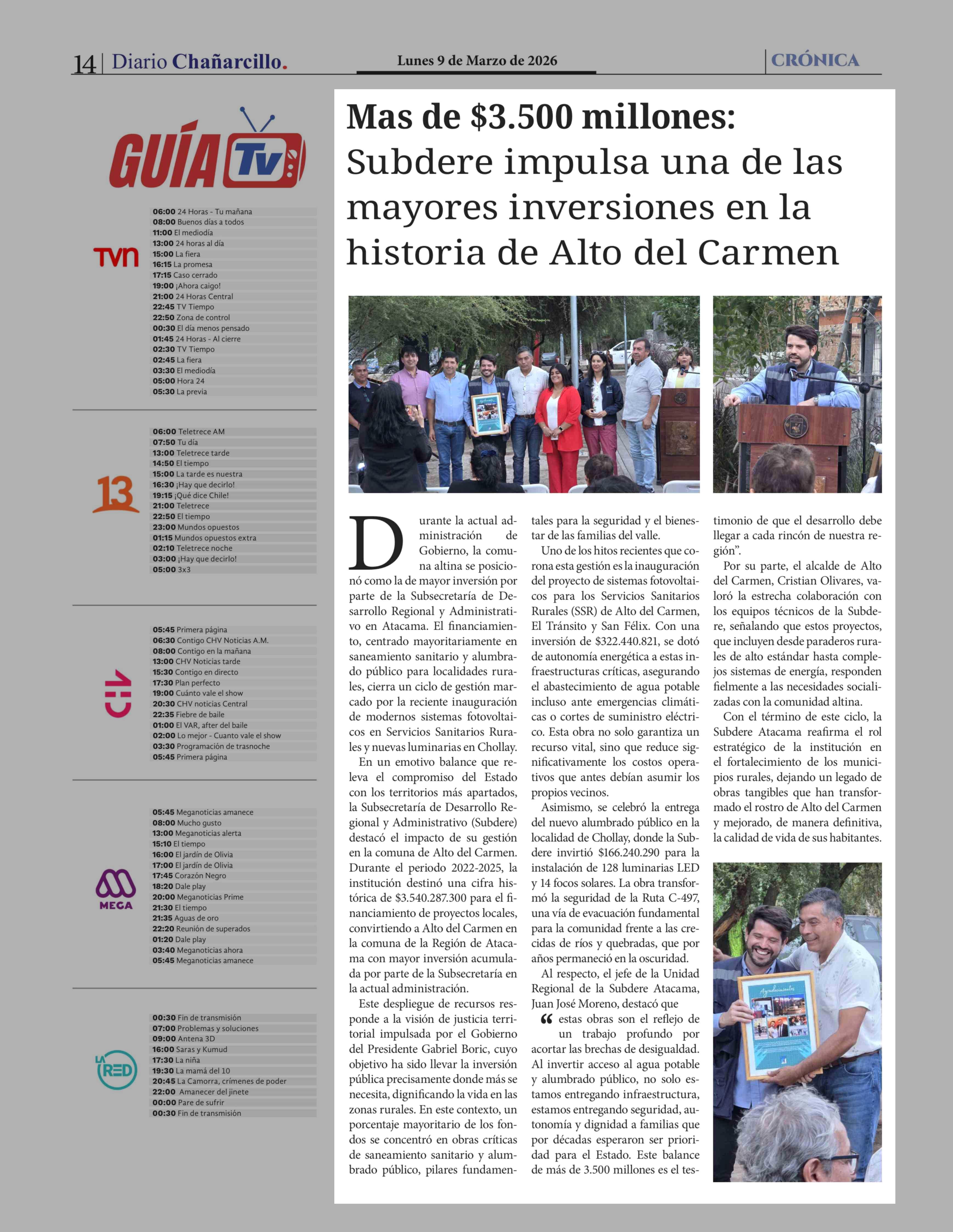Mas de $3.500 millones: Subdere impulsa una de las mayores inversiones en la historia de Alto del Carmen 09-03-2026 Diario Chañarcillo |