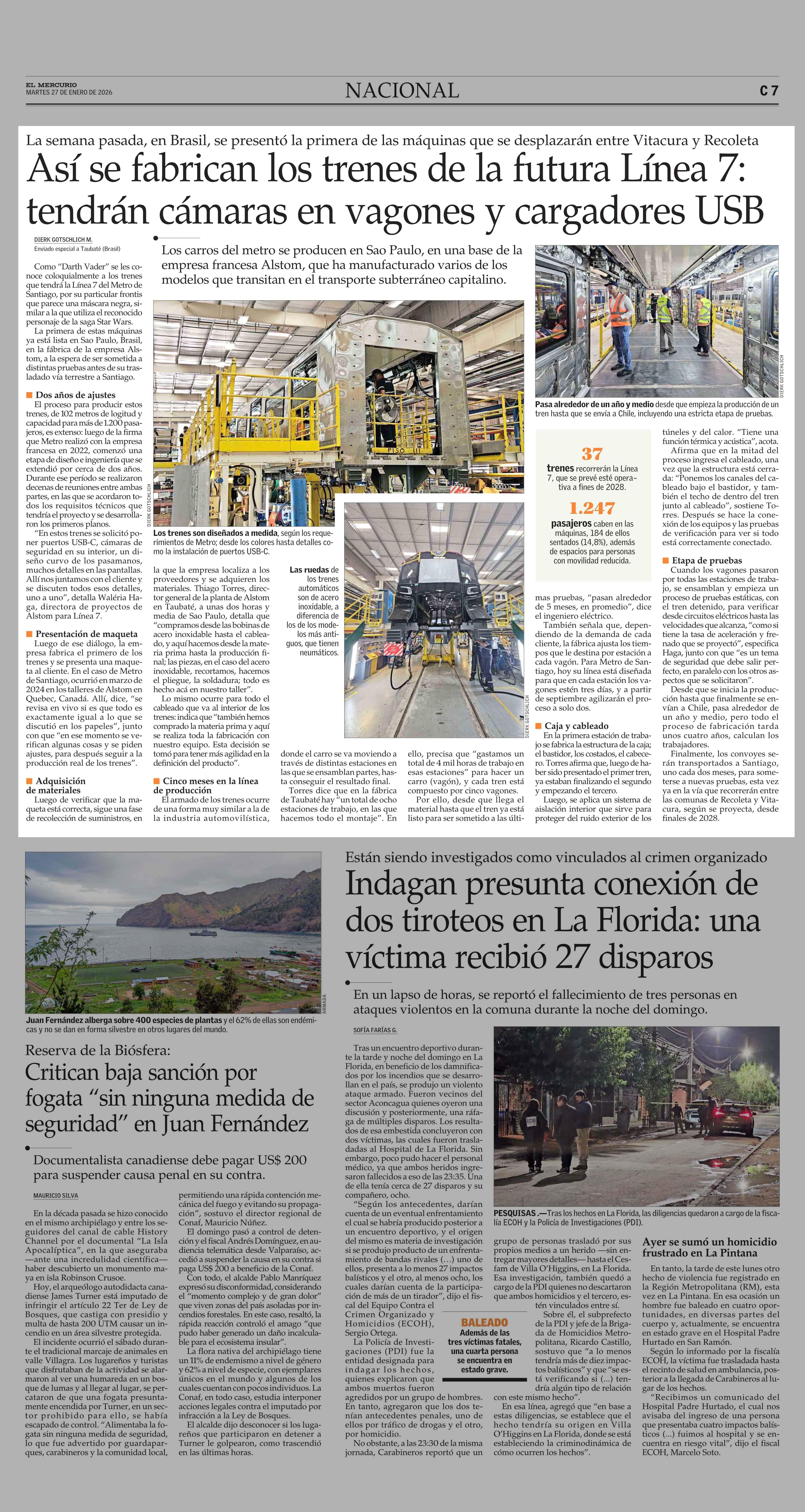 Así se fabrican los trenes de la futura Línea 7: tendrán cámaras en vagones y cargadores USB 27-01-2026 El Mercurio |