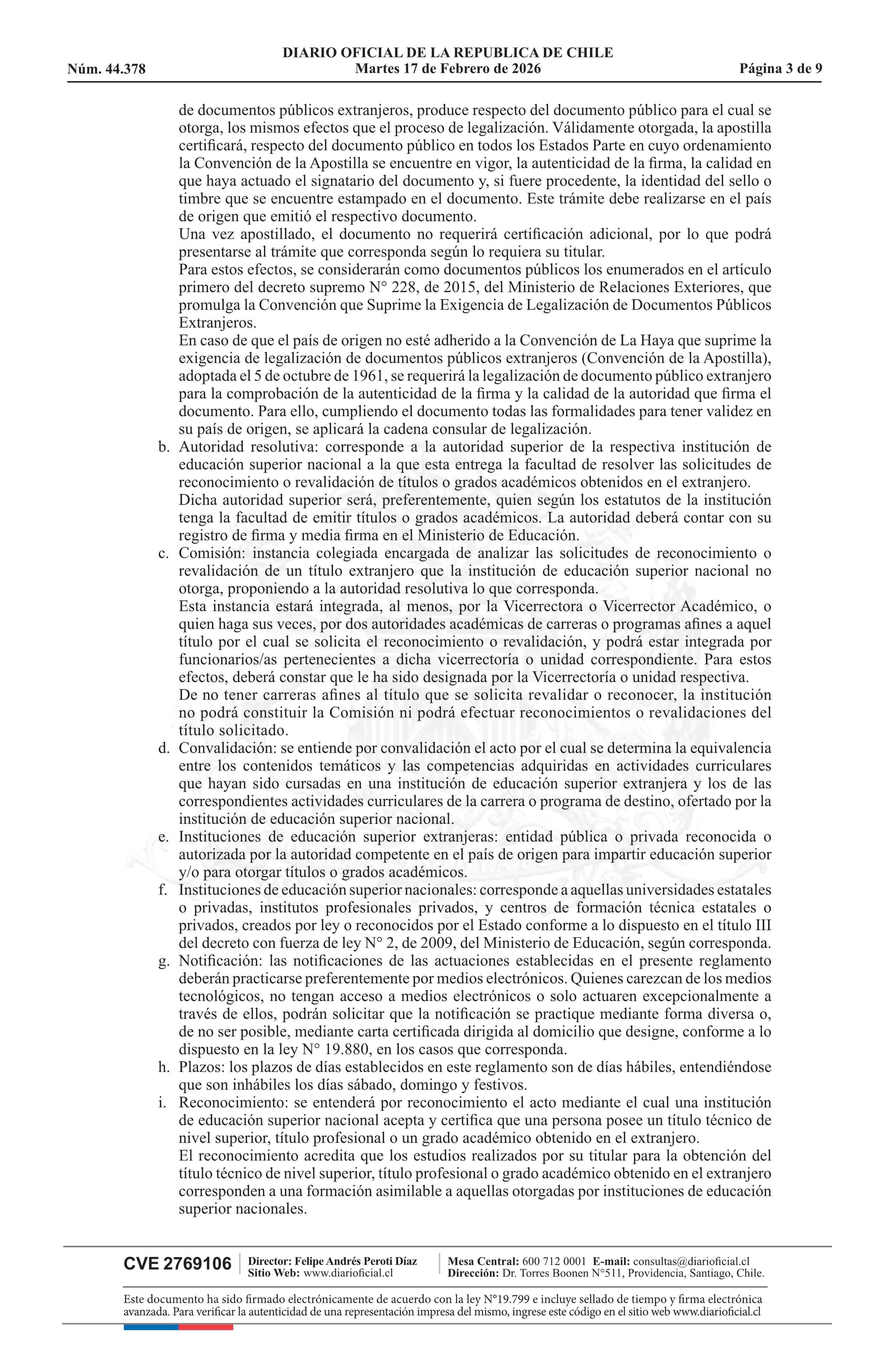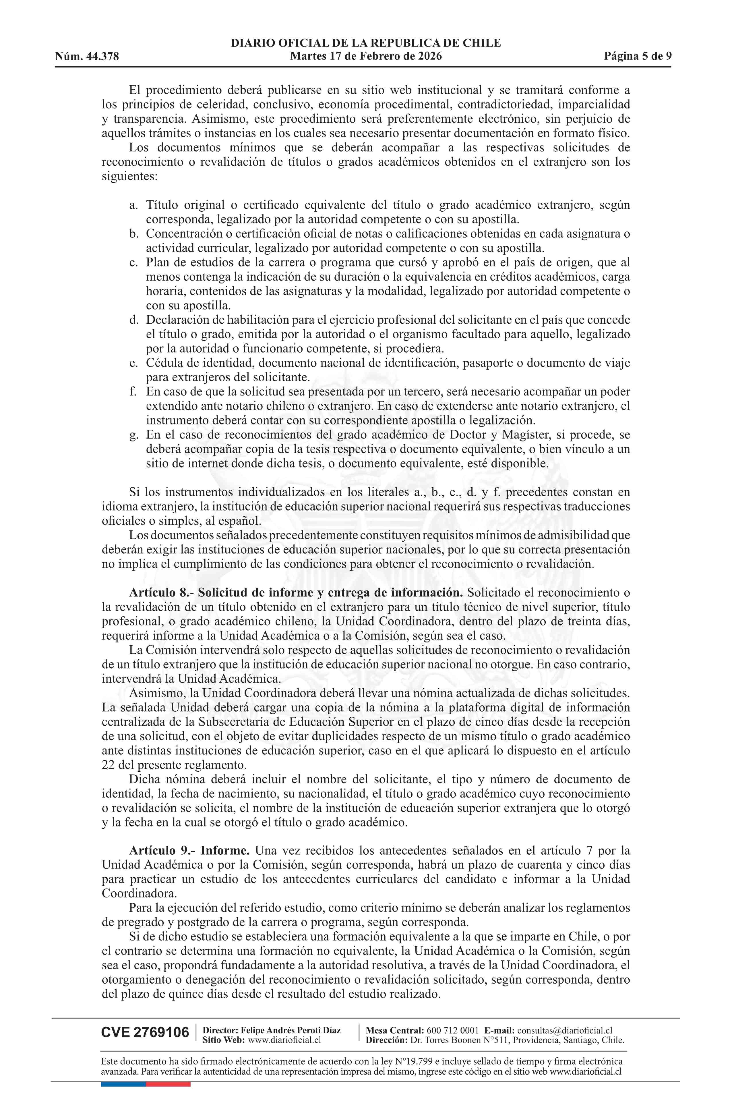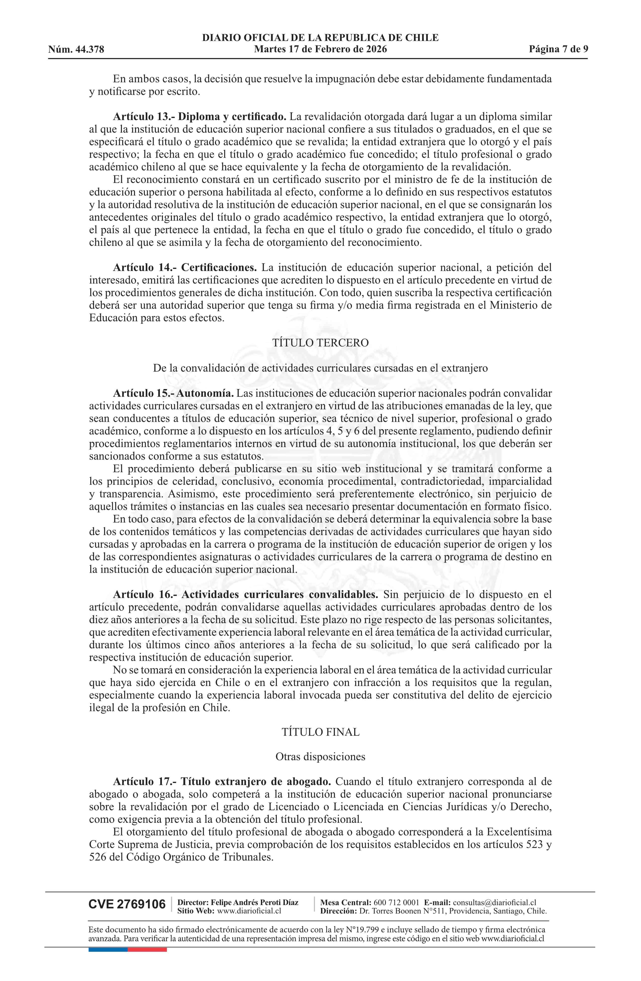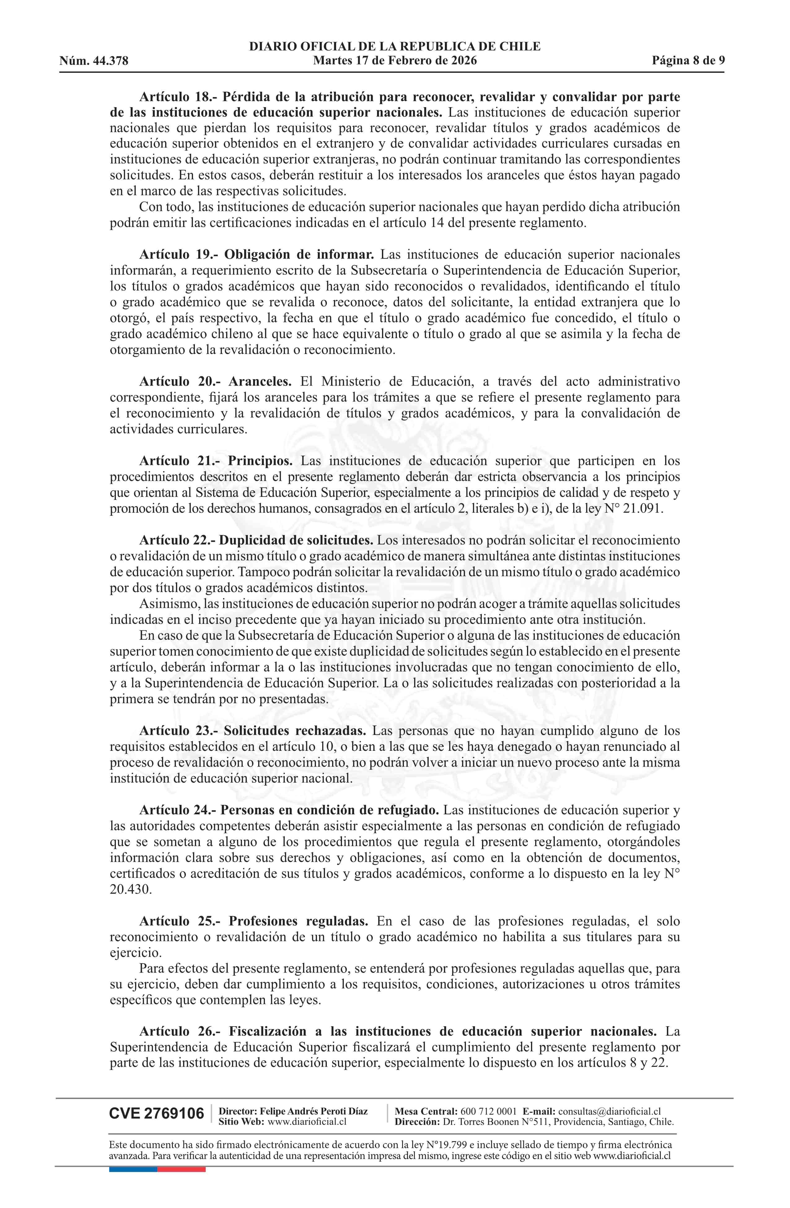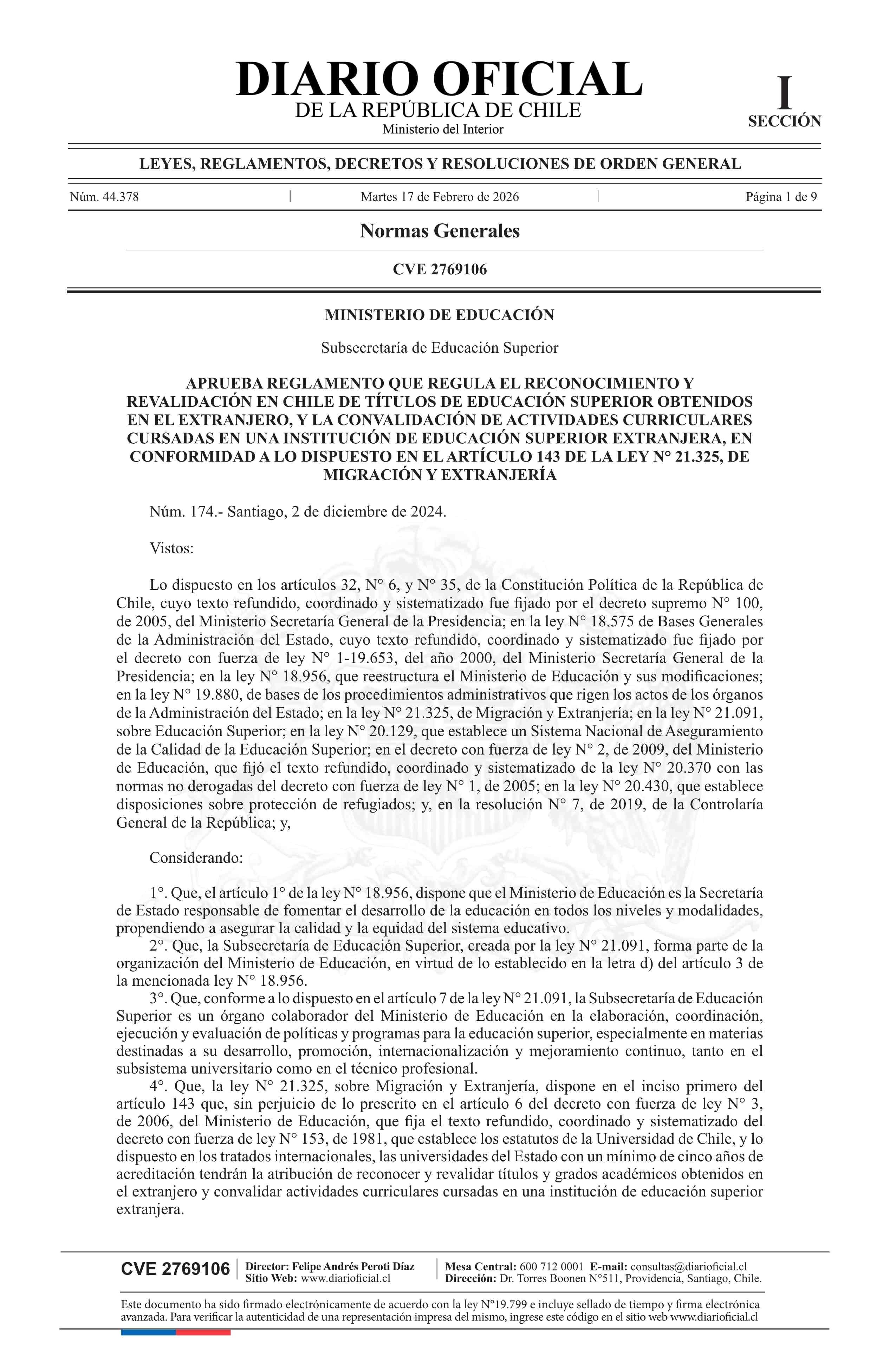 | Título: | Decreto número 174, de 2024.- Aprueba reglamento que regula el reconocimiento y revalidación en Chile de títulos de educación superior obtenidos en el extranjero, y la convalidación de actividades curriculares cursadas en una institución de educación superior extranjera, en conformidad a lo dispuest |