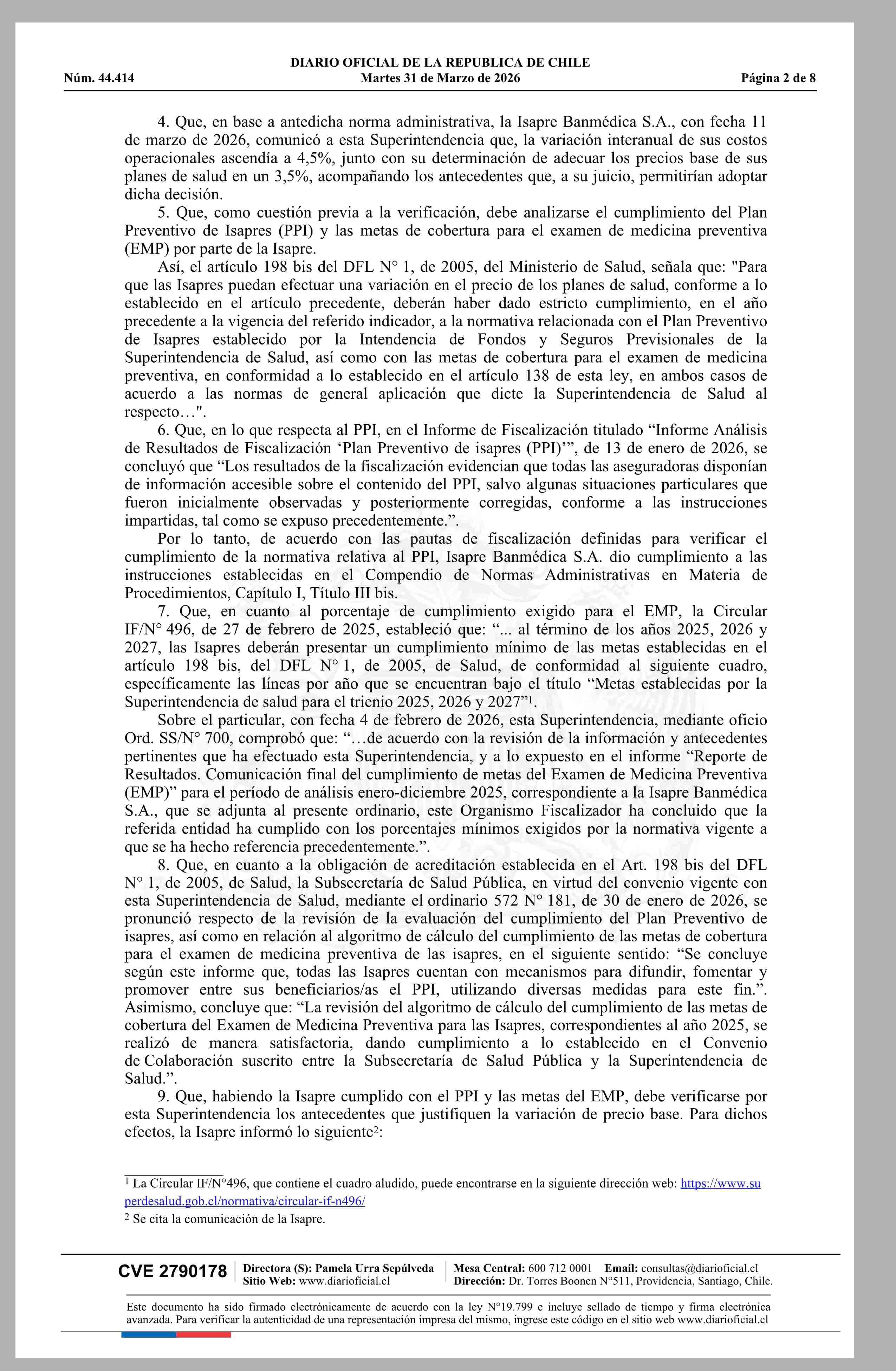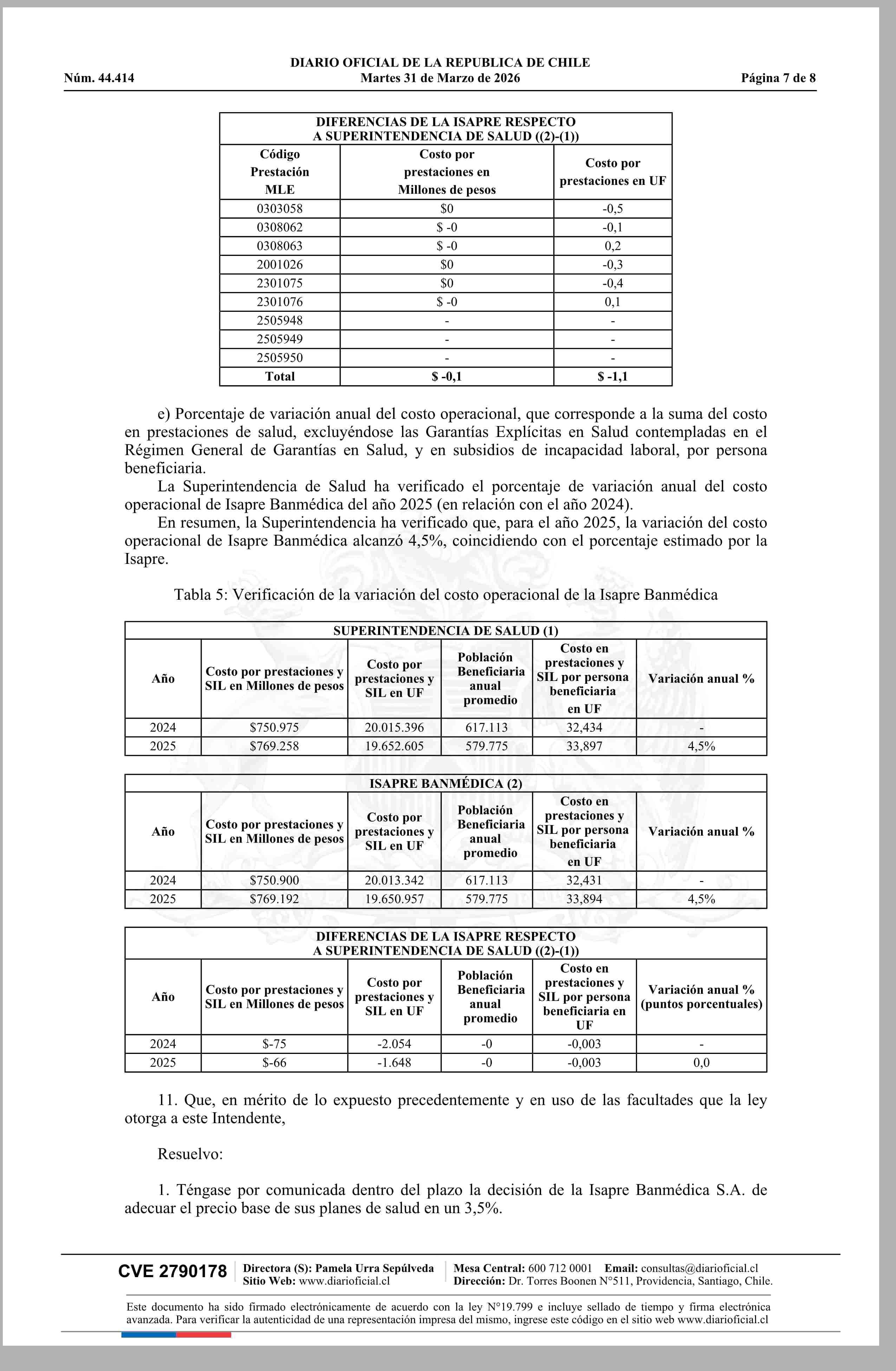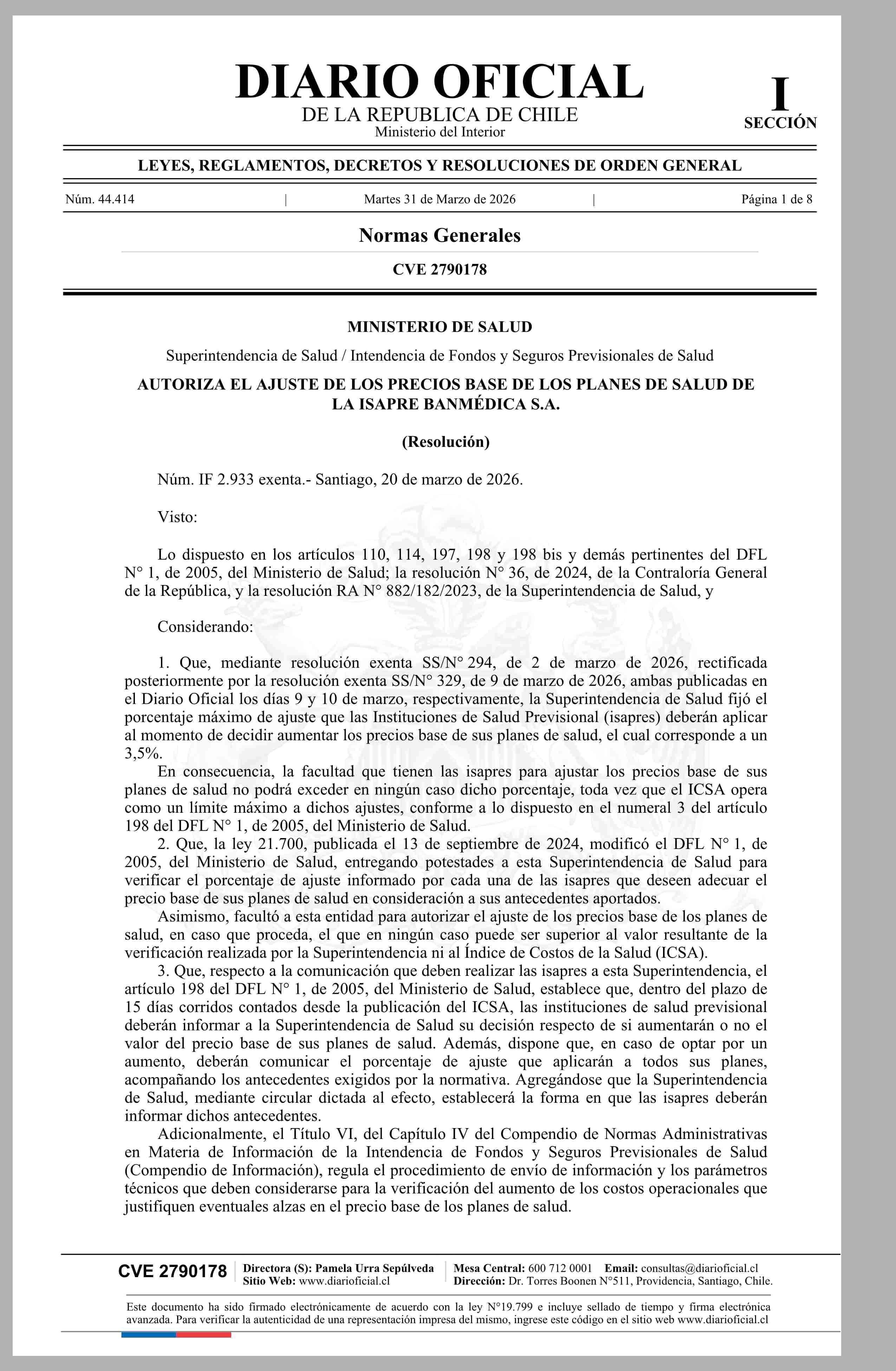 | Título: | Superintendencia de Salud / Intendencia de Fondos y Seguros Previsionales de Salud AUTORIZA EL AJUSTE DE LOS PRECIOS BASE DE LOS PLANES DE SALUD DE LA ISAPRE BANMÉDICA S.A. (Resolución) |