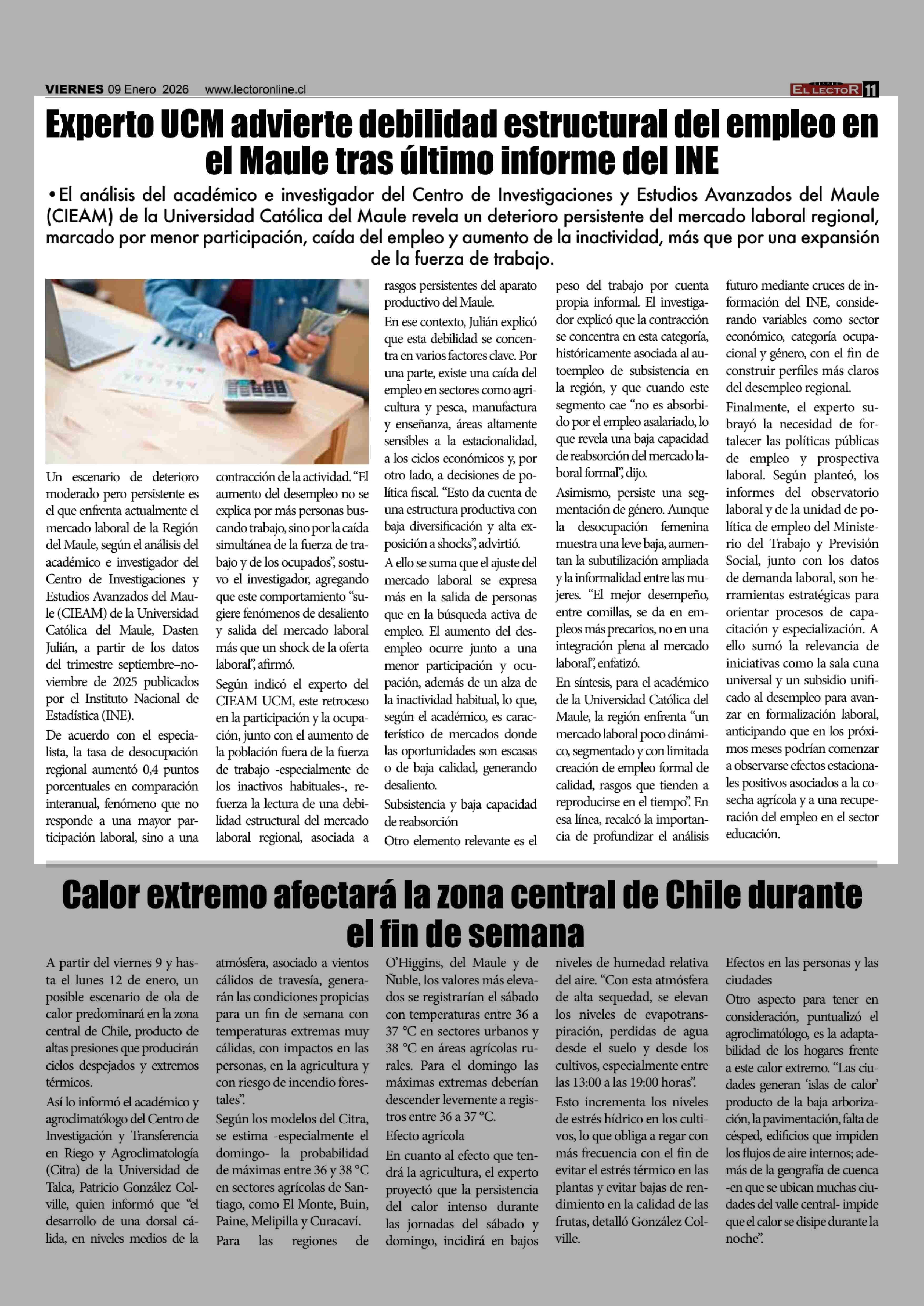 Experto UCM advierte debilidad estructural del empleo en el Maule tras último informe del INE 09-01-2026 El Lector |