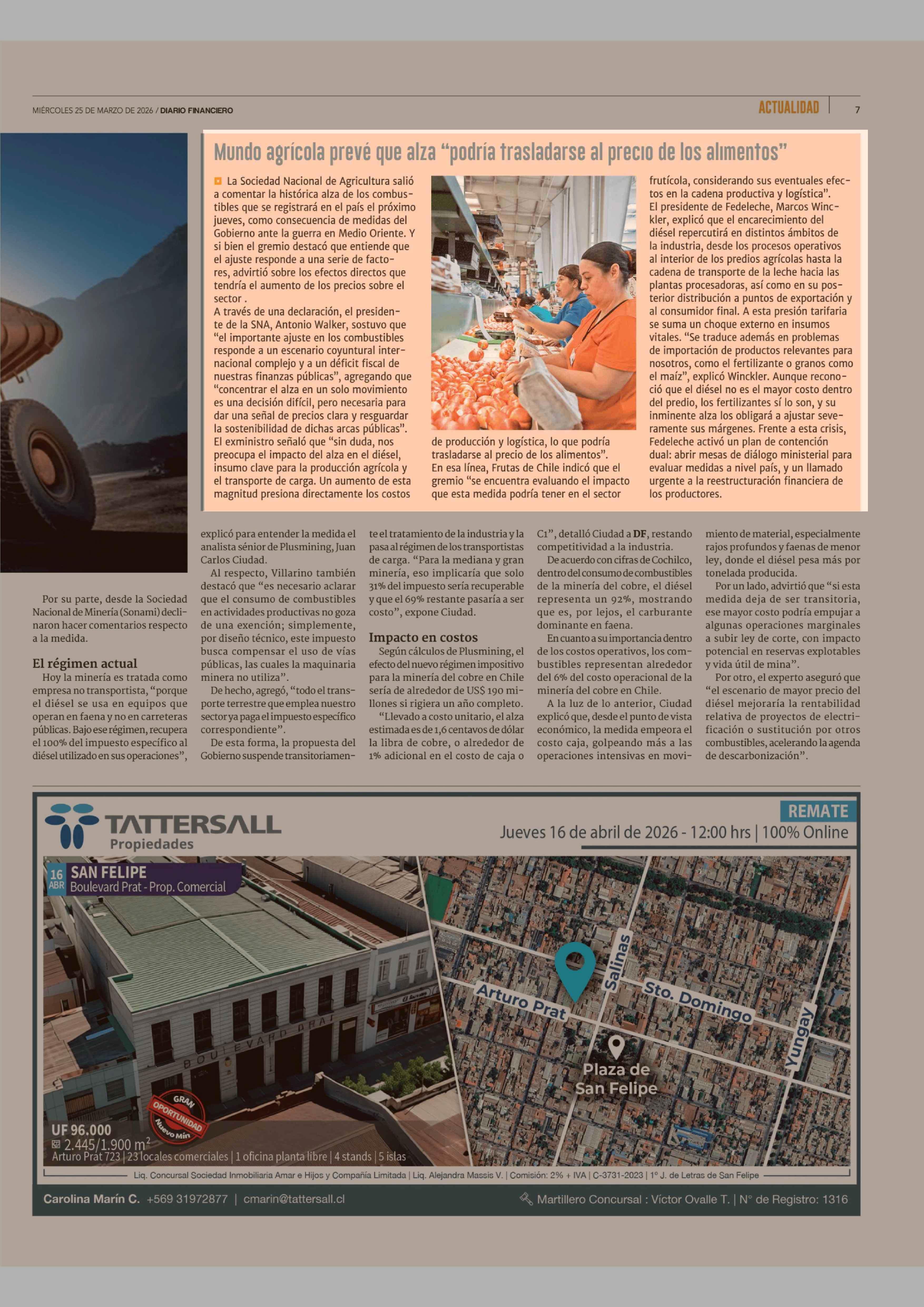 Mundo agrícola prevé que alza "podría trasladarse al precio de los alimentos" 25-03-2026 Diario Financiero |
