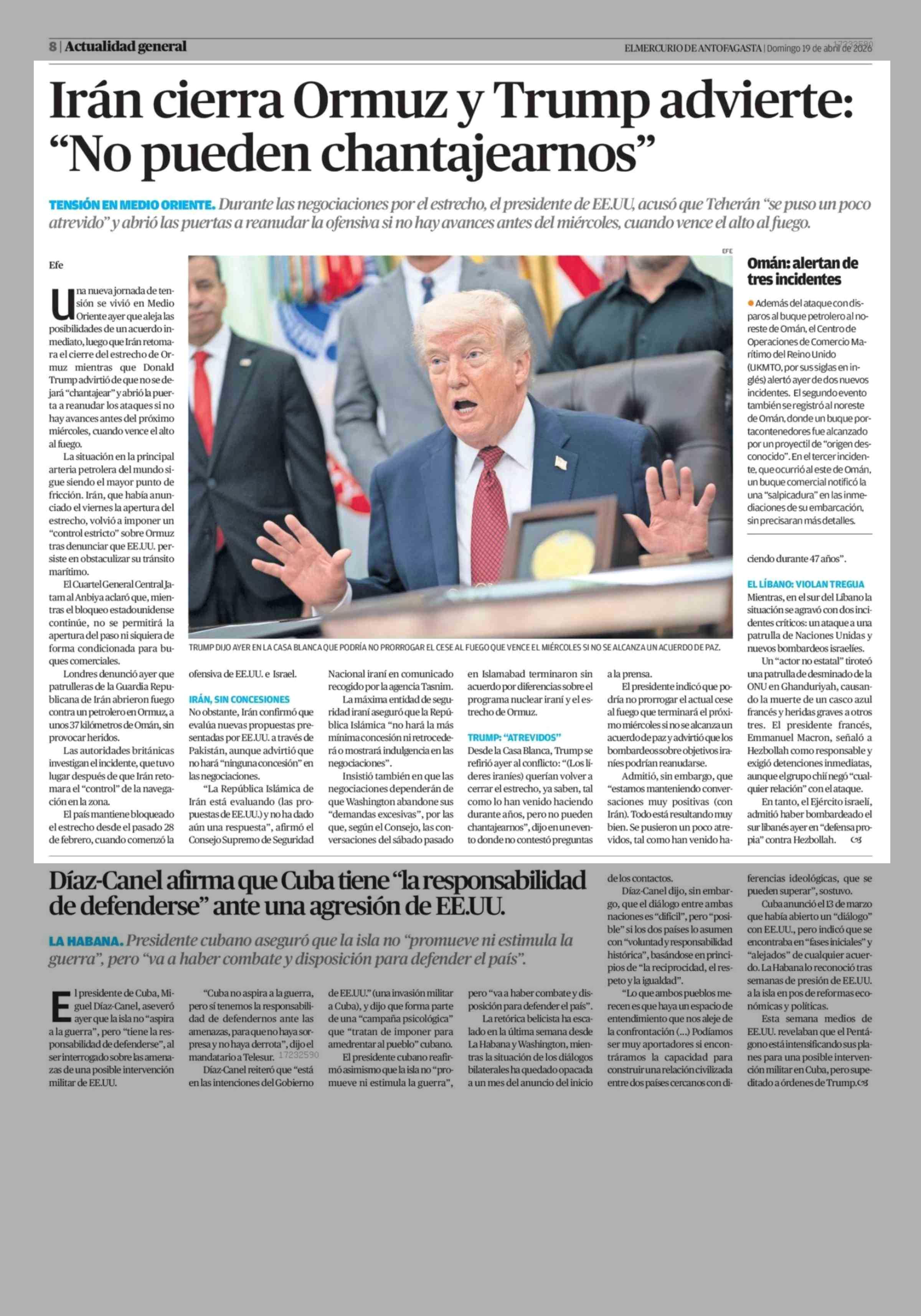 Irán cierra Ormuz y Trump advierte: "No pueden chantajearnos" 19-04-2026 El Mercurio de Antofagasta |