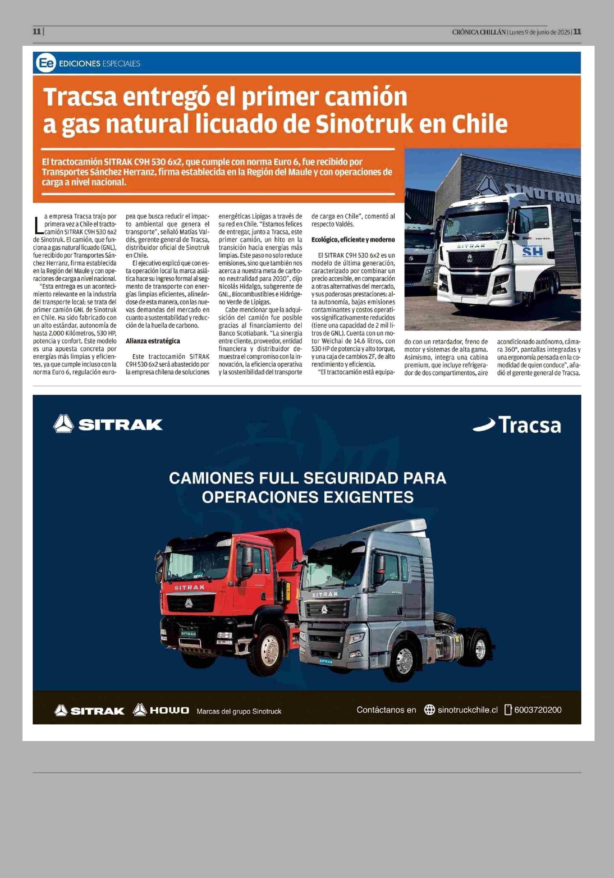 Título: Tracsa entregó el primer camión a gas natural licuado de Sinotruk en Chile