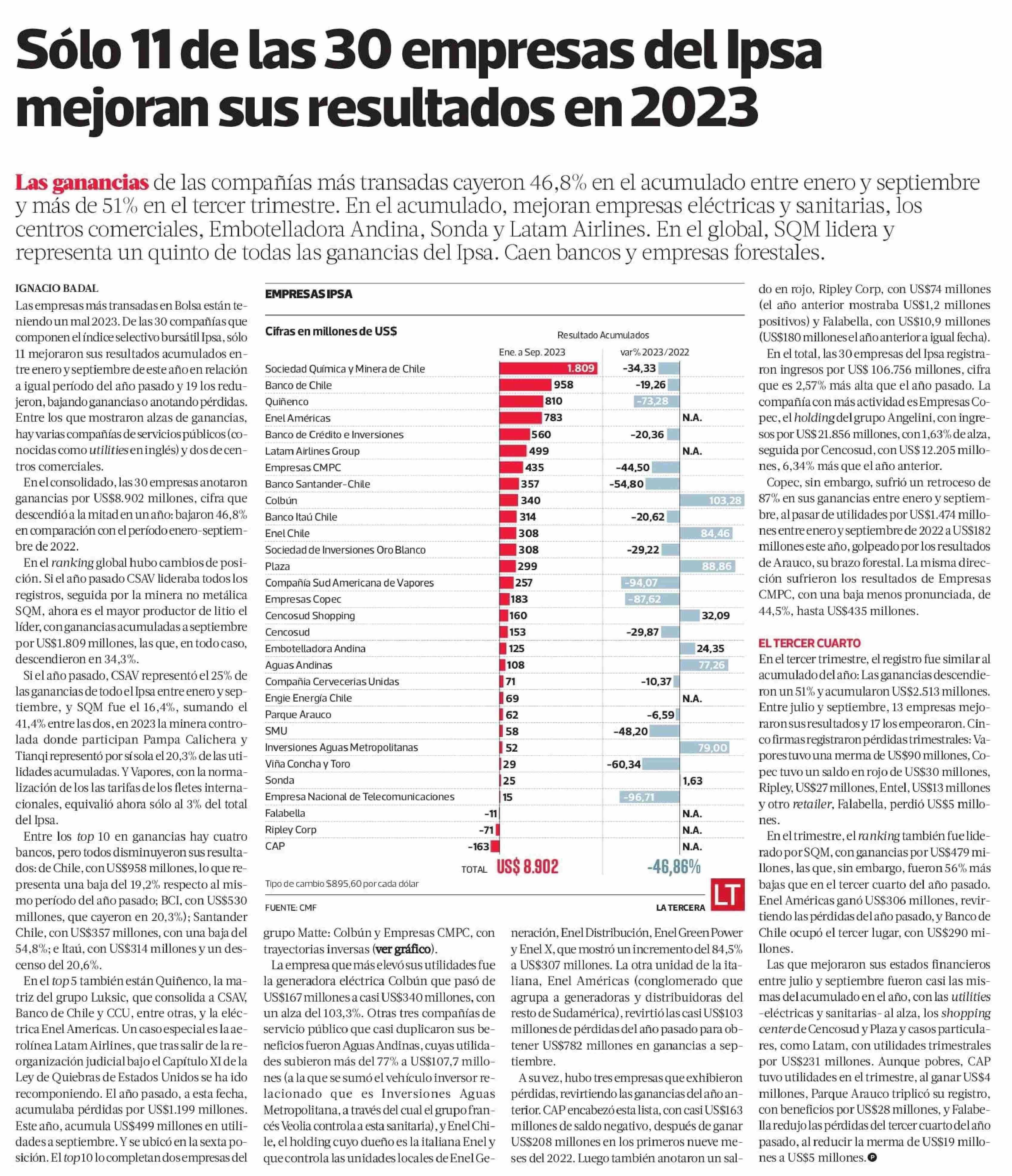 Sólo 11 de las 30 empresas del Ipsa mejoran sus resultados en 2023 30-11-2023 La Tercera |