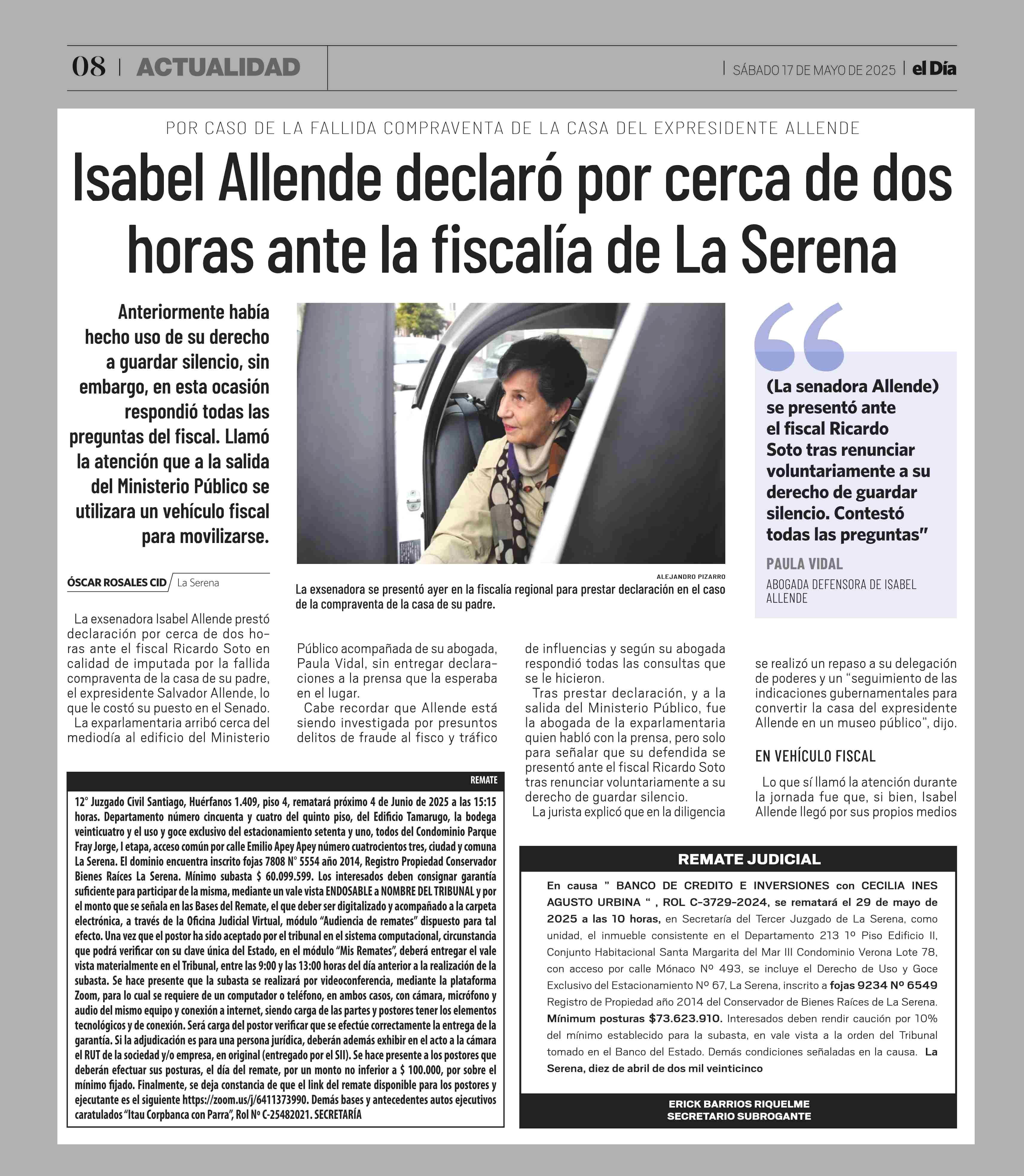 Isabel Allende declaró por cerca de dos horas ante la fiscalía de La Serena 17-05-2025 El Día |