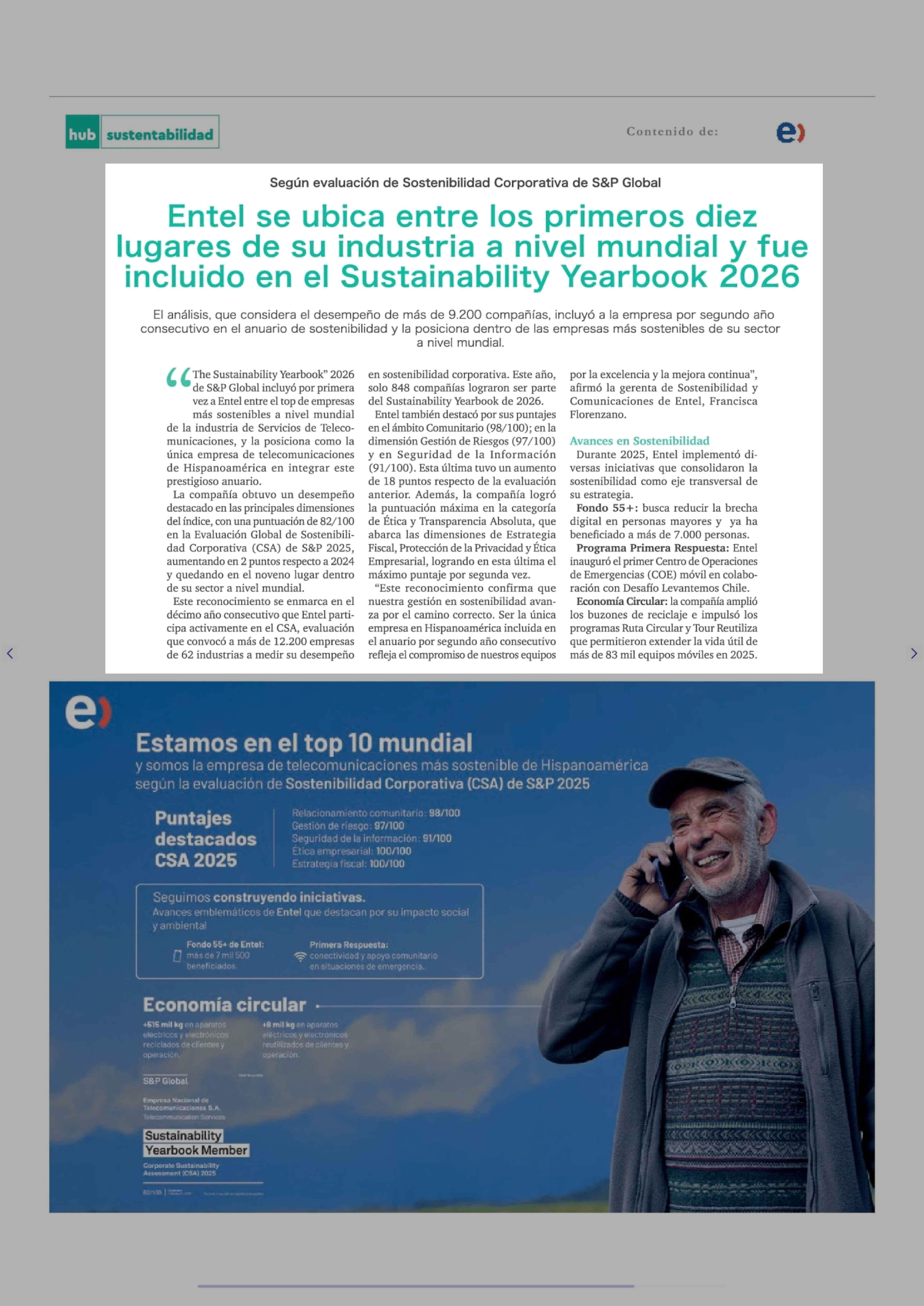 Título: Entel se ubica entre los primeros diez lugares de su industria a nivel mundial y fue incluido en el Sustainability Yearbook 2026
