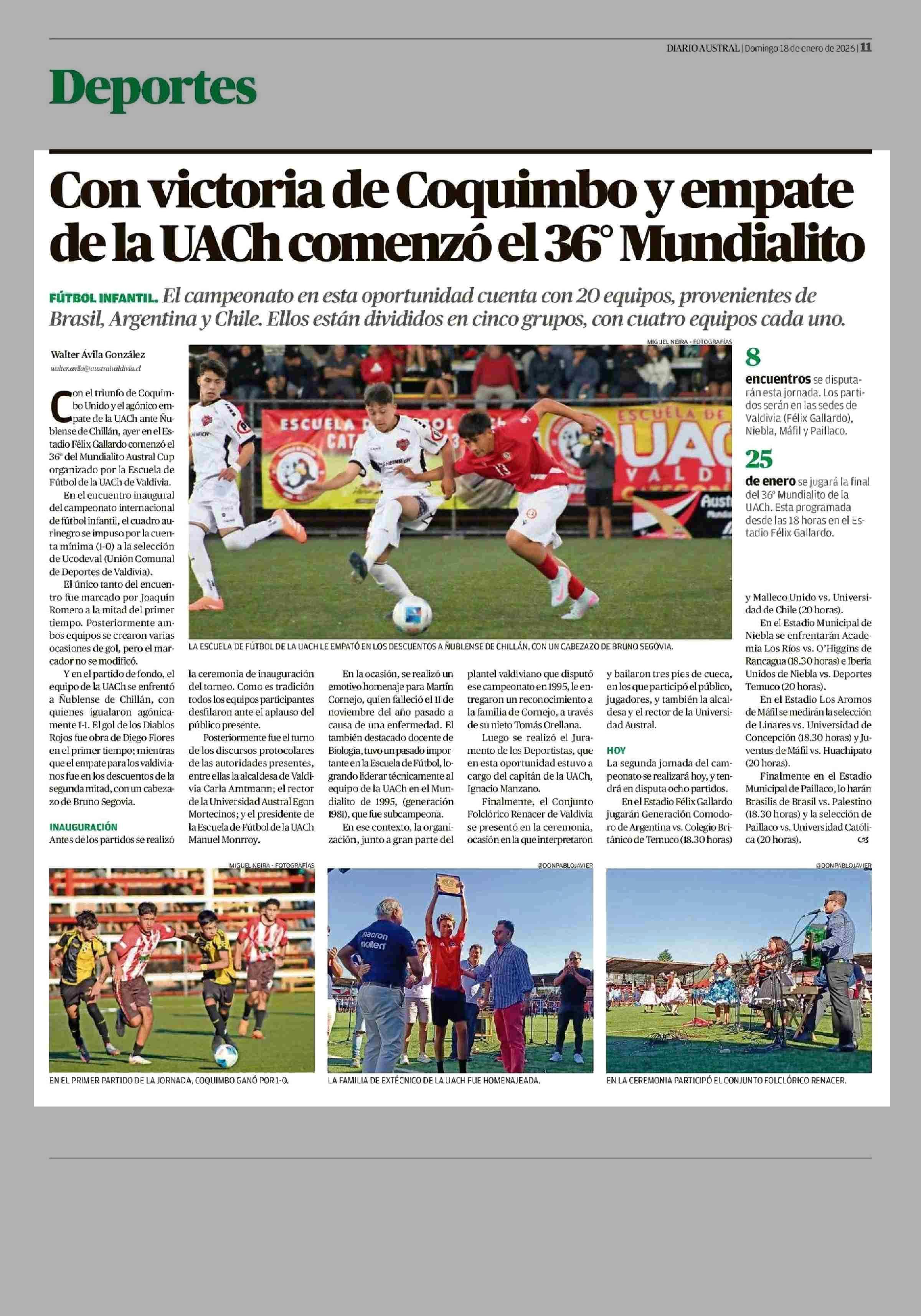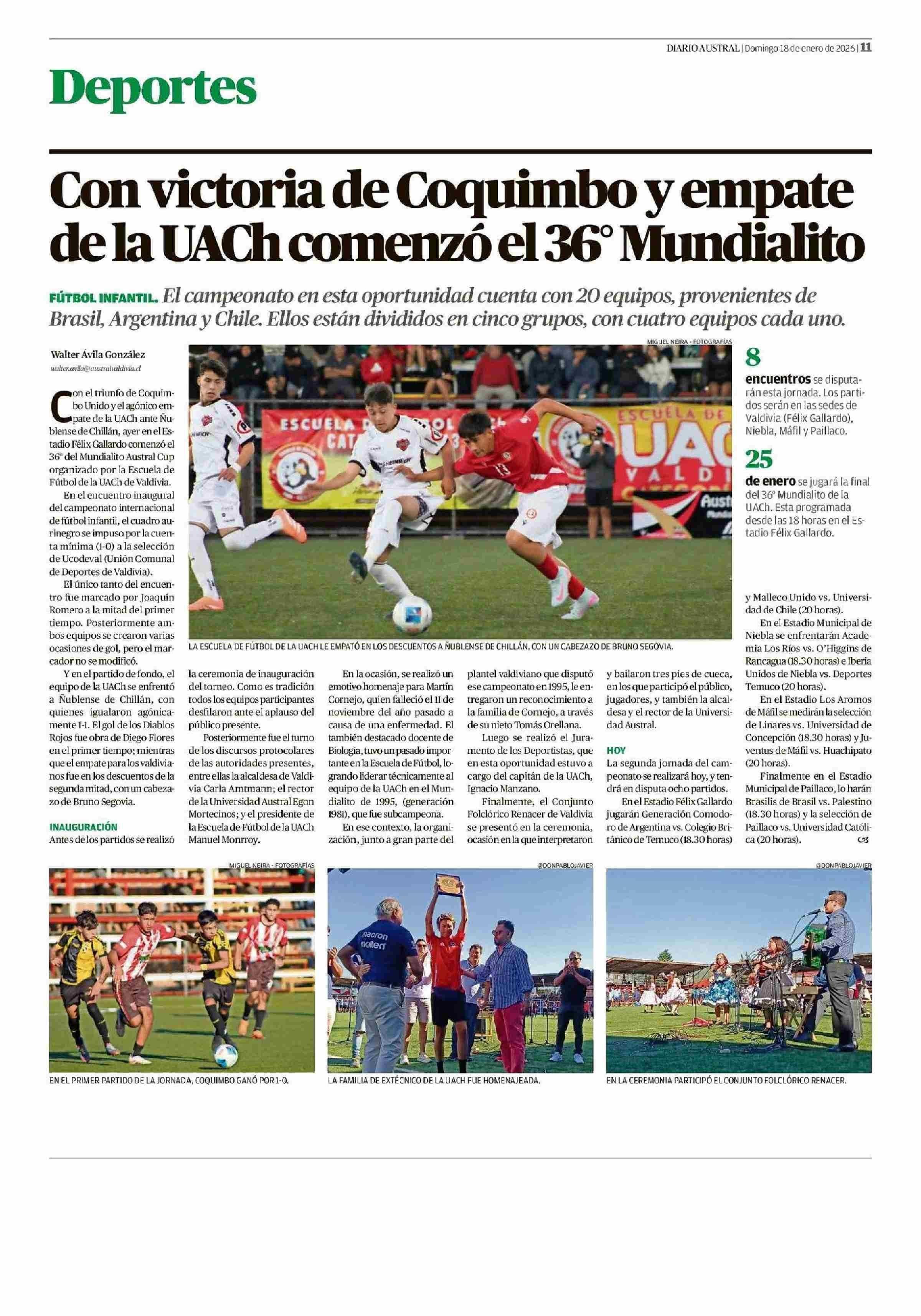 Con victoria de Coquimbo y empate de la UACh comenzó el 36° Mundialito 18-01-2026 Diario Austral Región de Los Ríos |