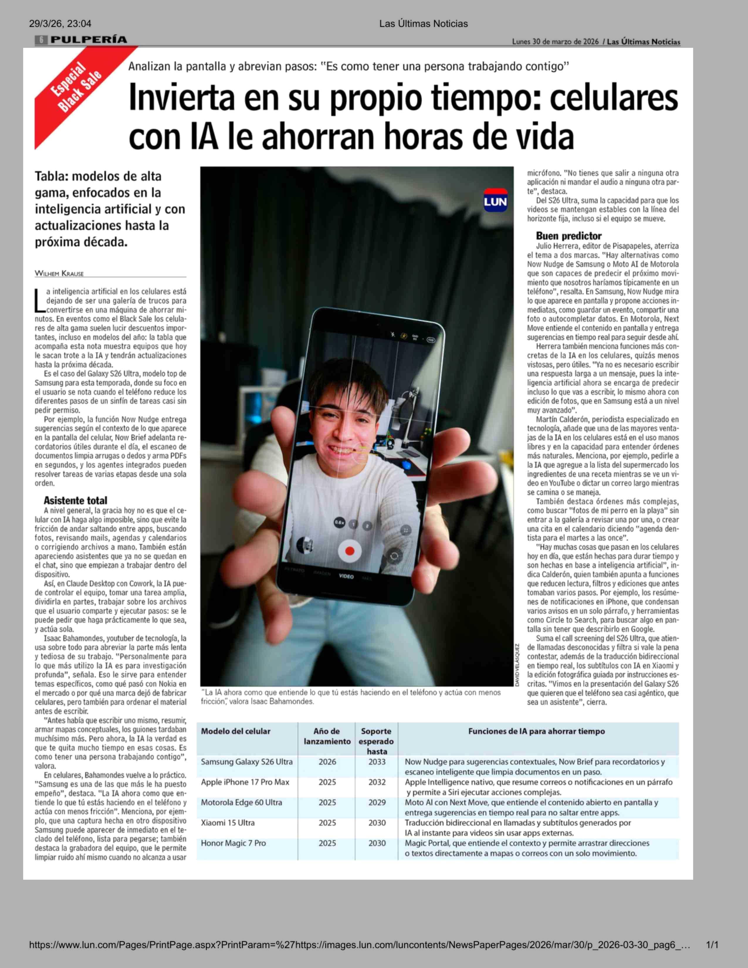 Invierta en su propio tiempo: celulares con IA le ahorran horas de vida 30-03-2026 Las Últimas Noticias |