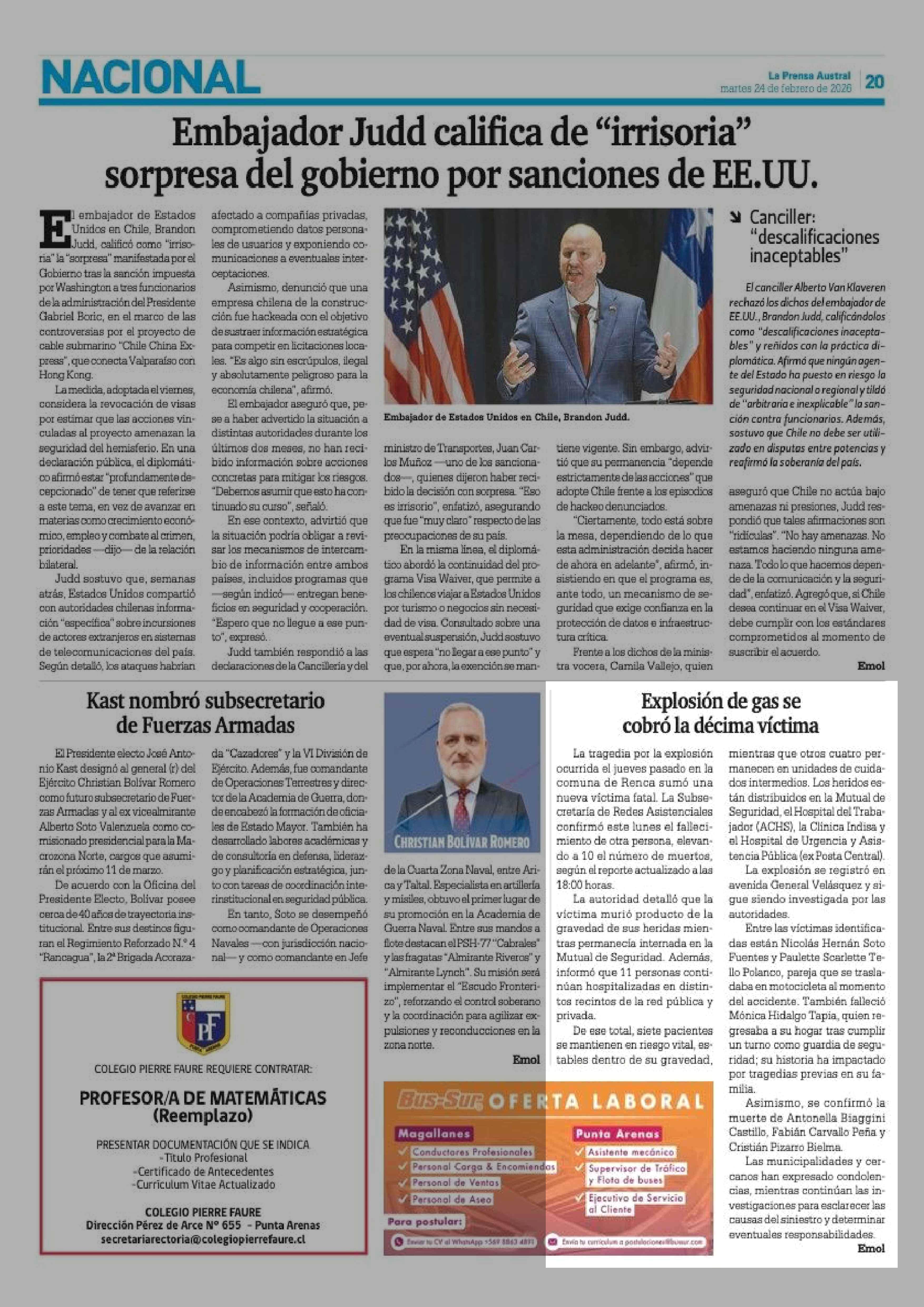 Explosión de gas se cobró la décima víctima 24-02-2026 La Prensa Austral |