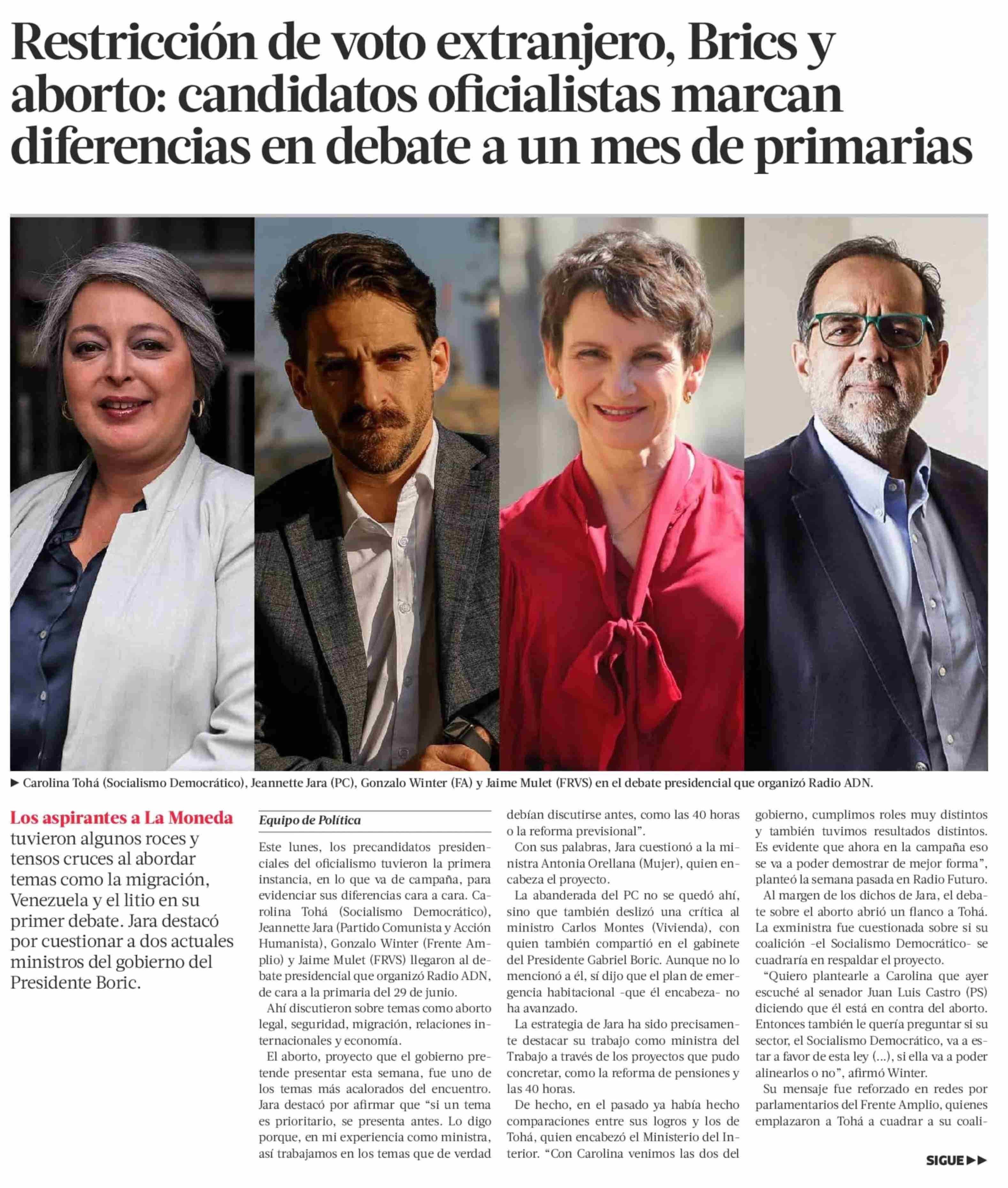Restricción de voto extranjero, Brics y aborto: candidatos oficialistas marcan diferencias en debate a un mes de primarias 27-05-2025 La Tercera |