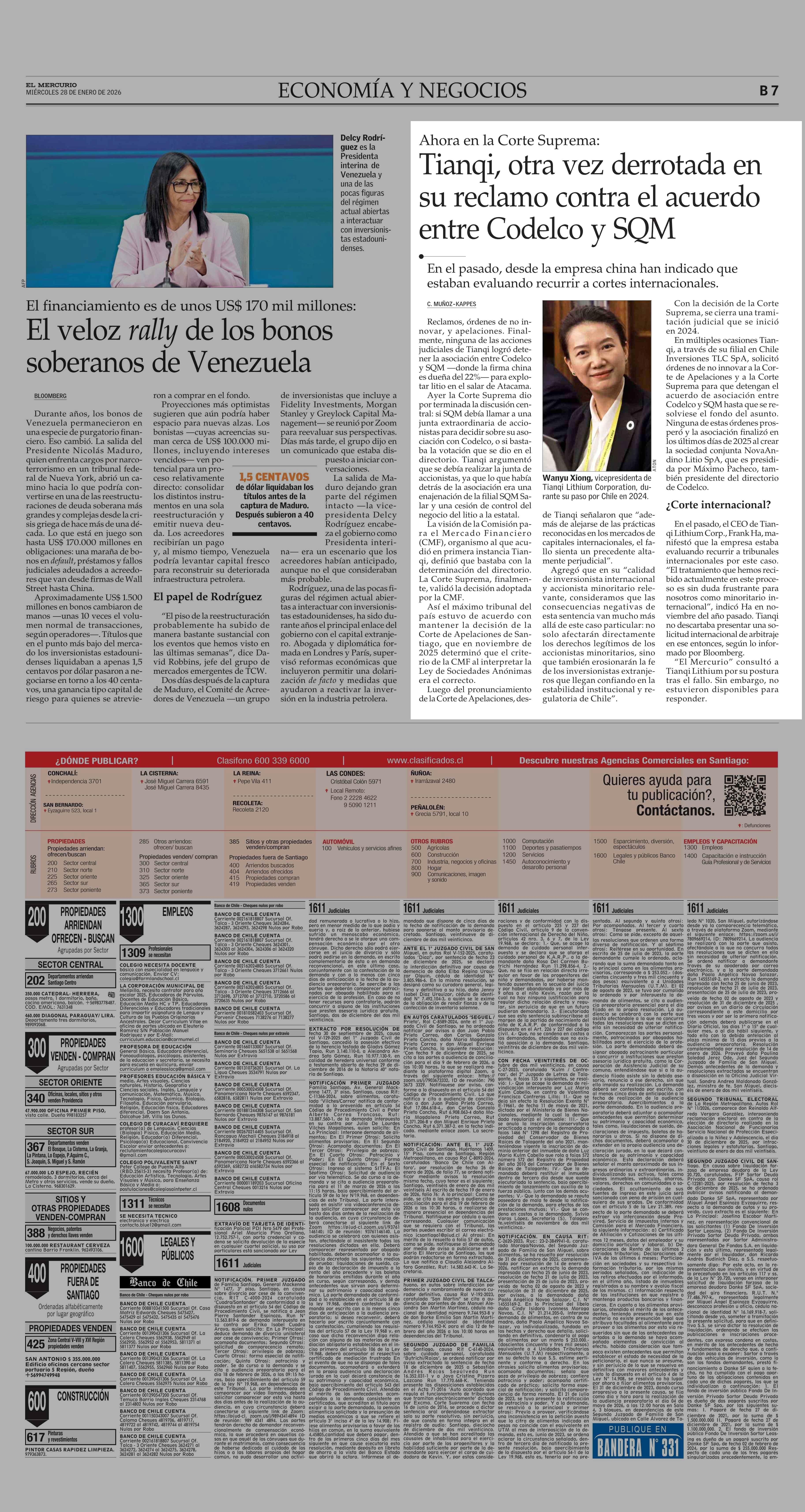 Tiangi, otra vez derrotada en su reclamo contra el acuerdo entre Codelco y SQM 28-01-2026 El Mercurio |