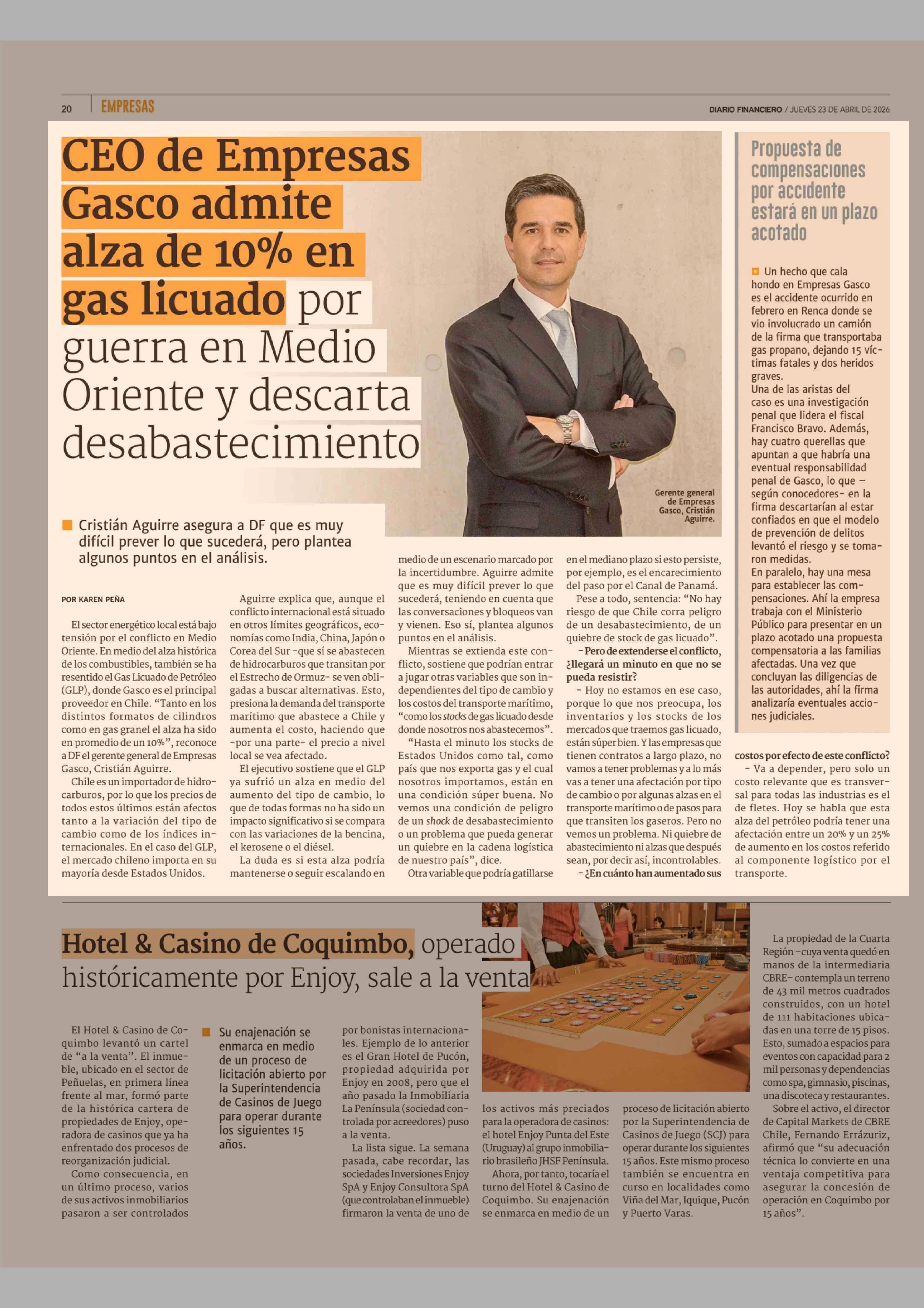 Título: CEO de Empresas Gasco admite alza de 10% en gas licuado por guerra en Medio Oriente y descarta desabastecimiento