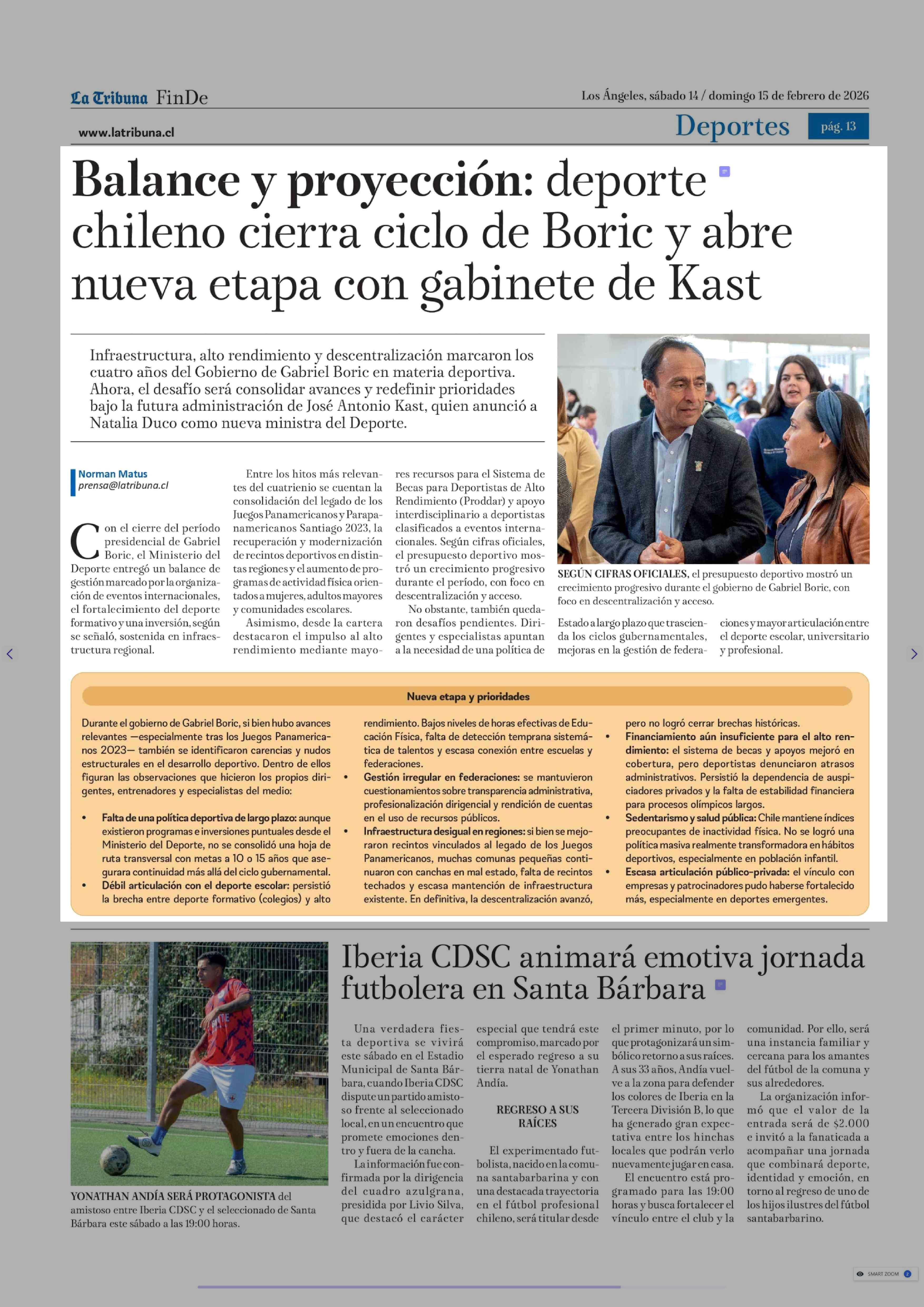 Balance y proyección: deporte chileno cierra ciclo de Boric y abre nueva etapa con gabinete de Kast 14-02-2026 La Tribuna |