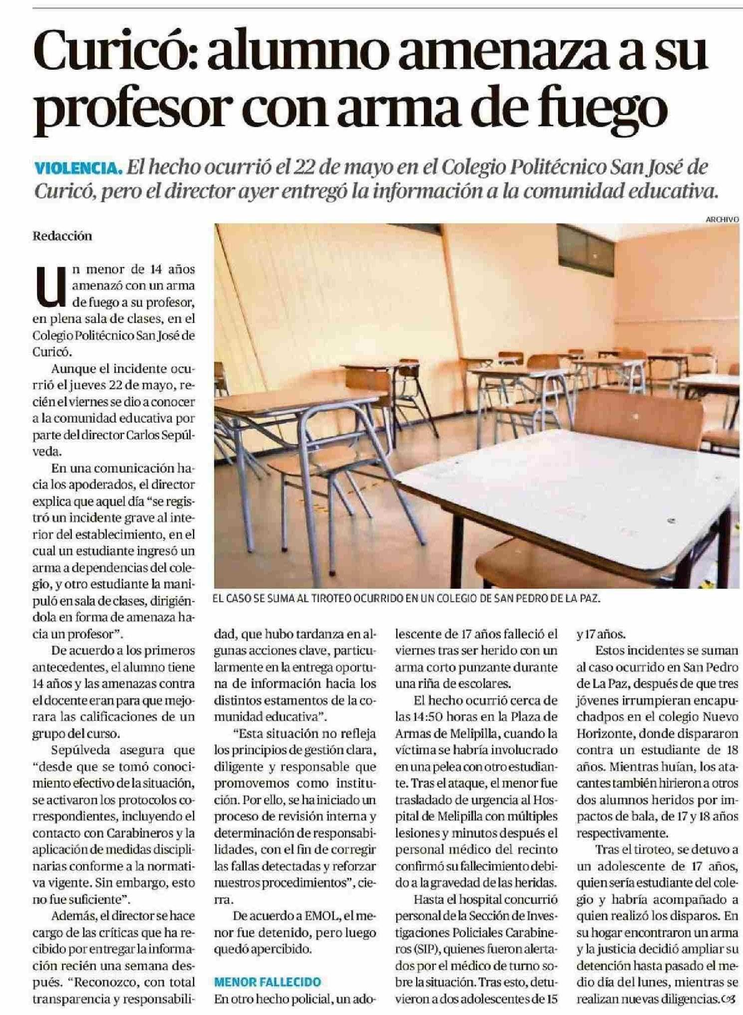 Curicó: alumno amenaza a su profesor con arma de fuego 01-06-2025 Diario Austral Región de Los Ríos |
