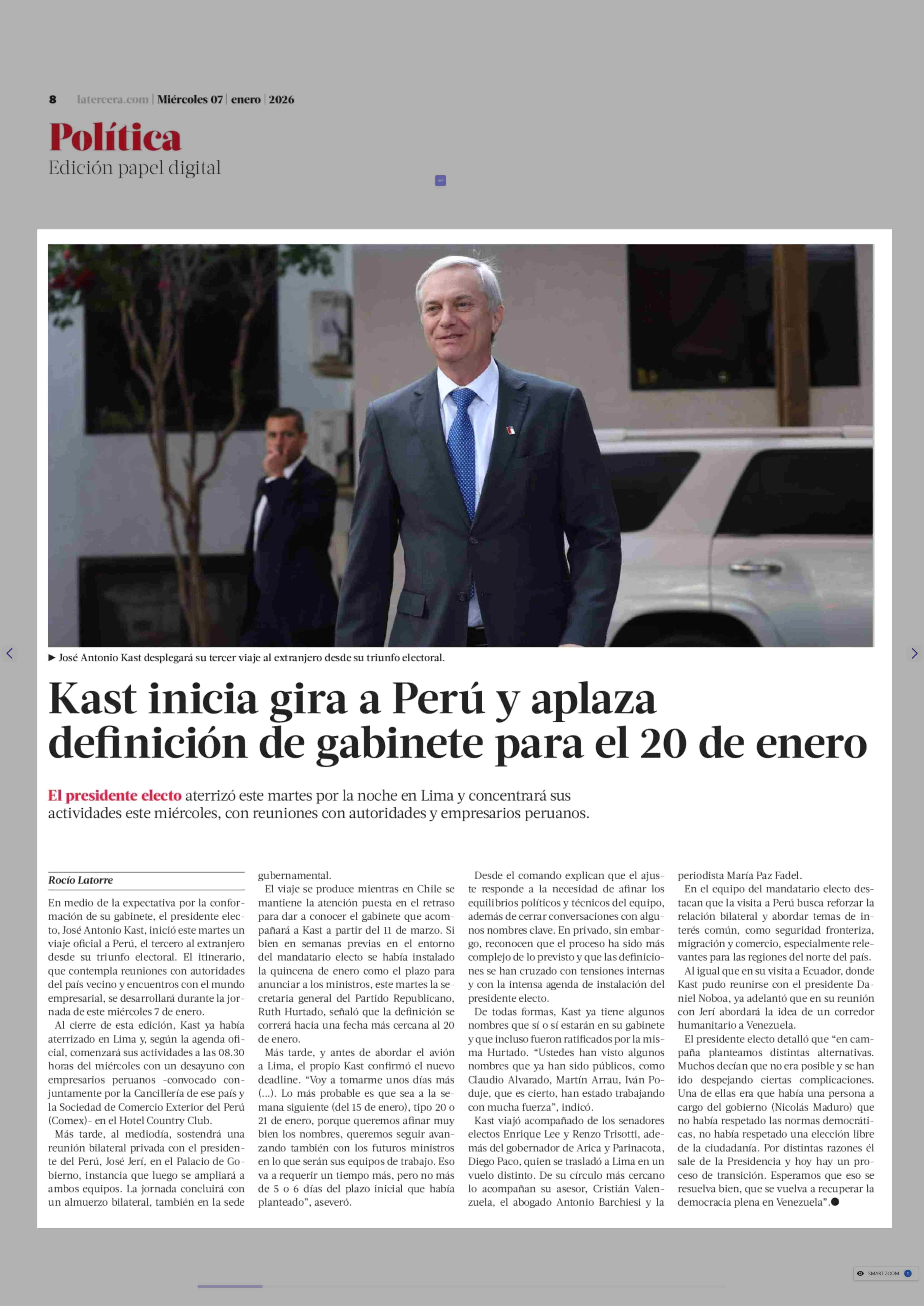 Kast inicia gira a Perú y aplaza definición de gabinete para el 20 de enero 07-01-2026 La Tercera |