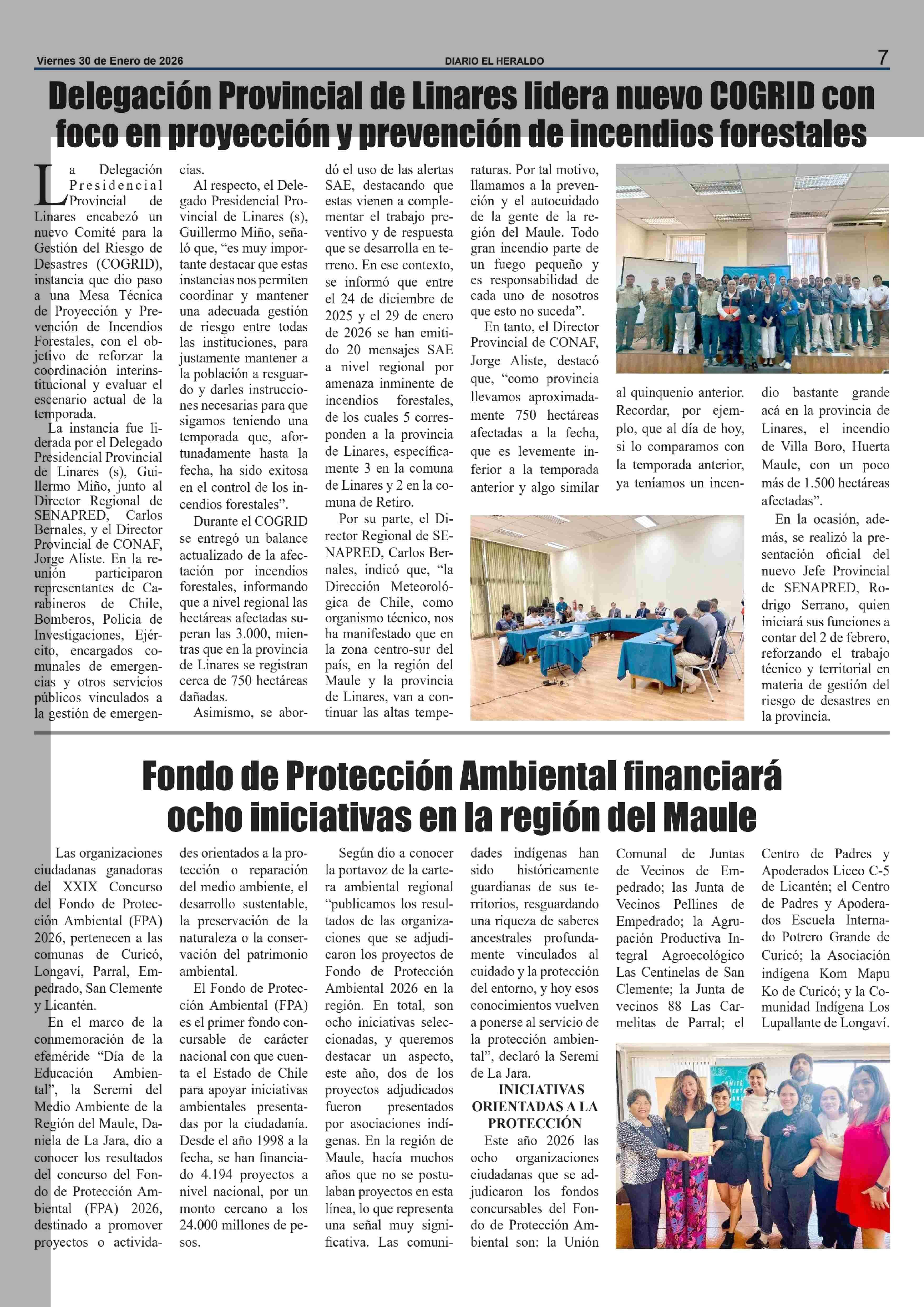 Delegación Provincial de Linares lidera nuevo COGRID con foco en proyección y prevención de incendios forestales 30-01-2026 El Heraldo |