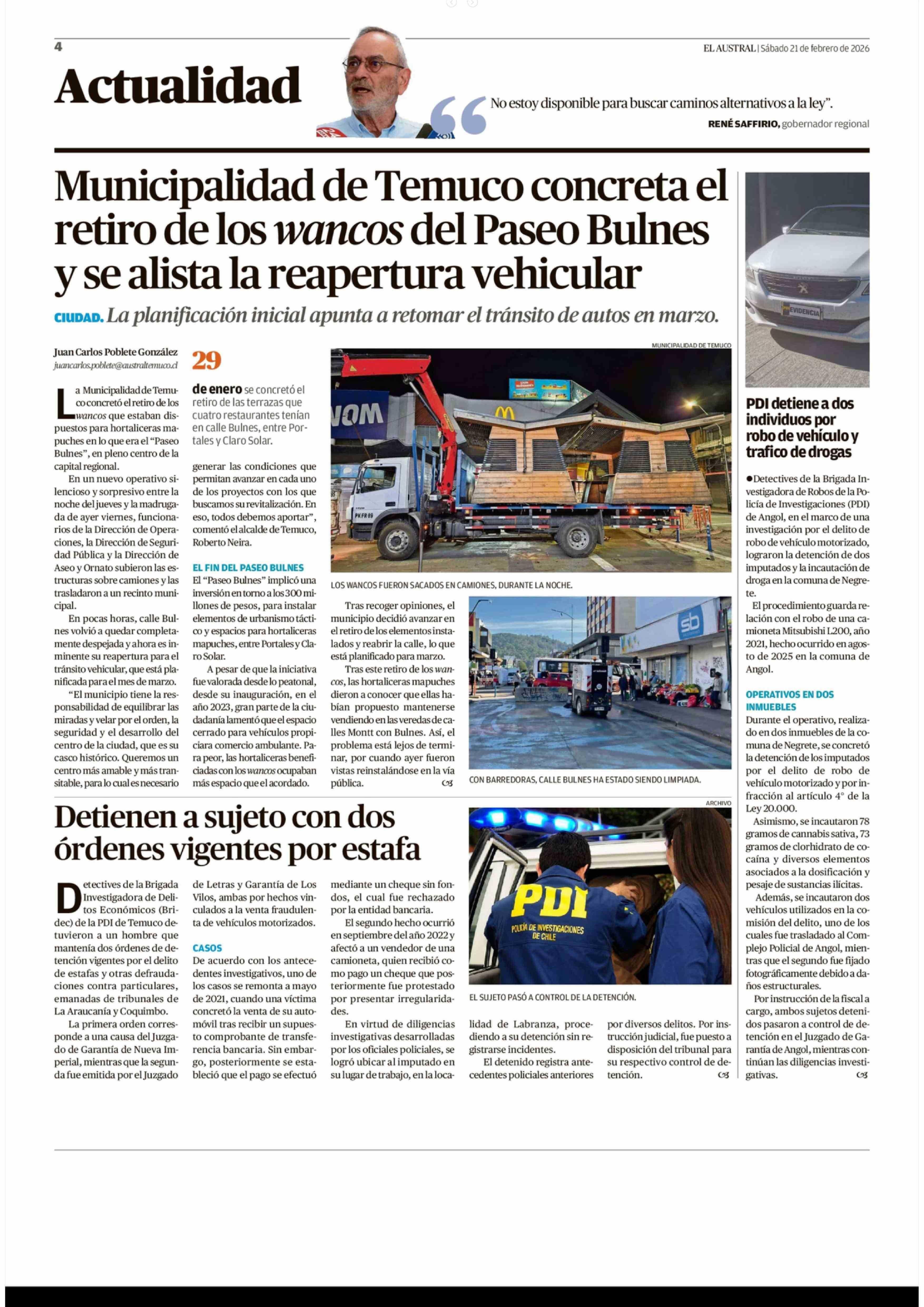 Municipalidad de Temuco concreta el retiro de los wancos del Paseo Bulnes y se alista la reapertura vehicular 21-02-2026 El Austral de la Araucanía |