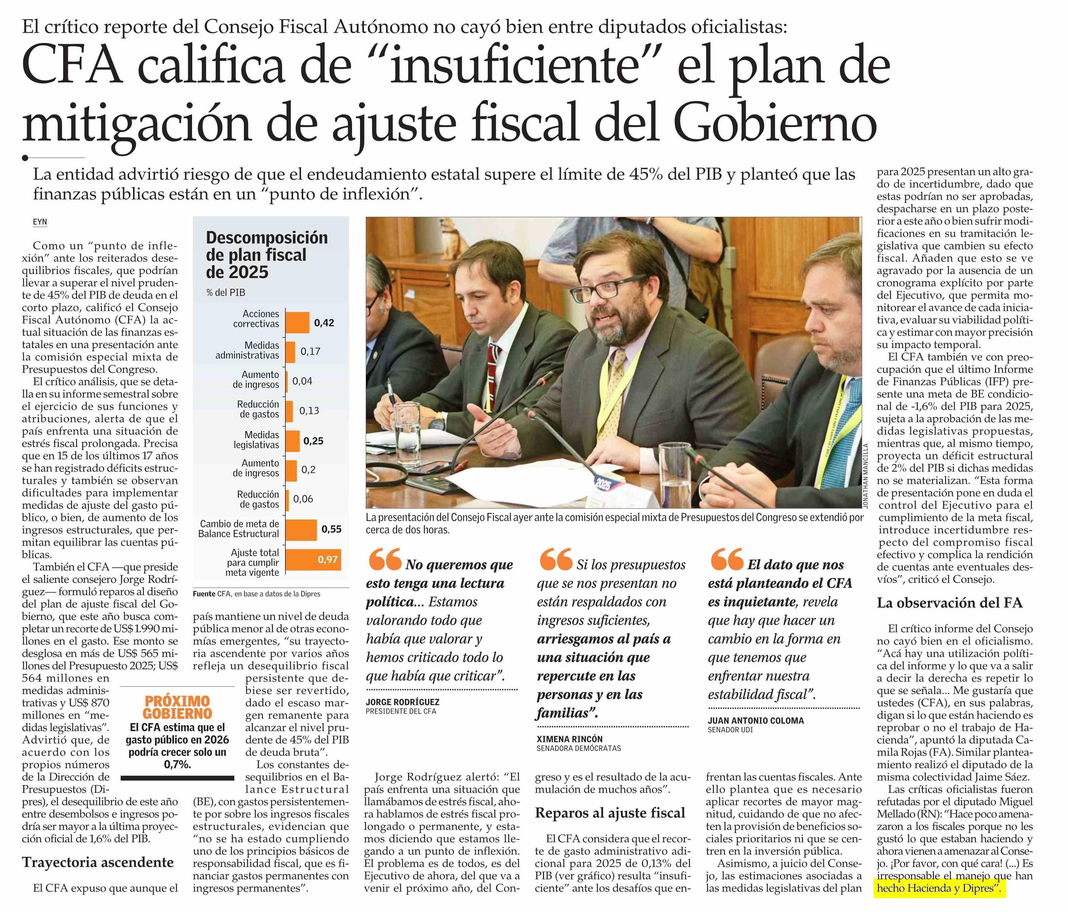 CFA califica de "insuficiente" el plan de mitigación de ajuste fiscal del Gobierno 14-05-2025 El Mercurio |