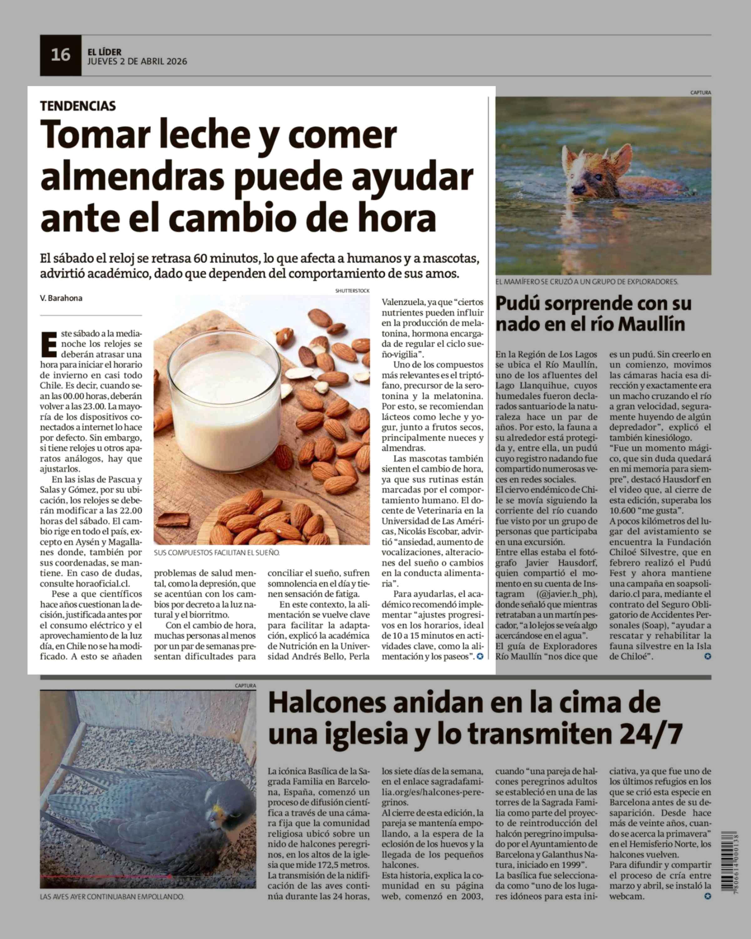 Tomar leche y comer almendras puede ayudar ante el cambio de hora 02-04-2026 El Líder |