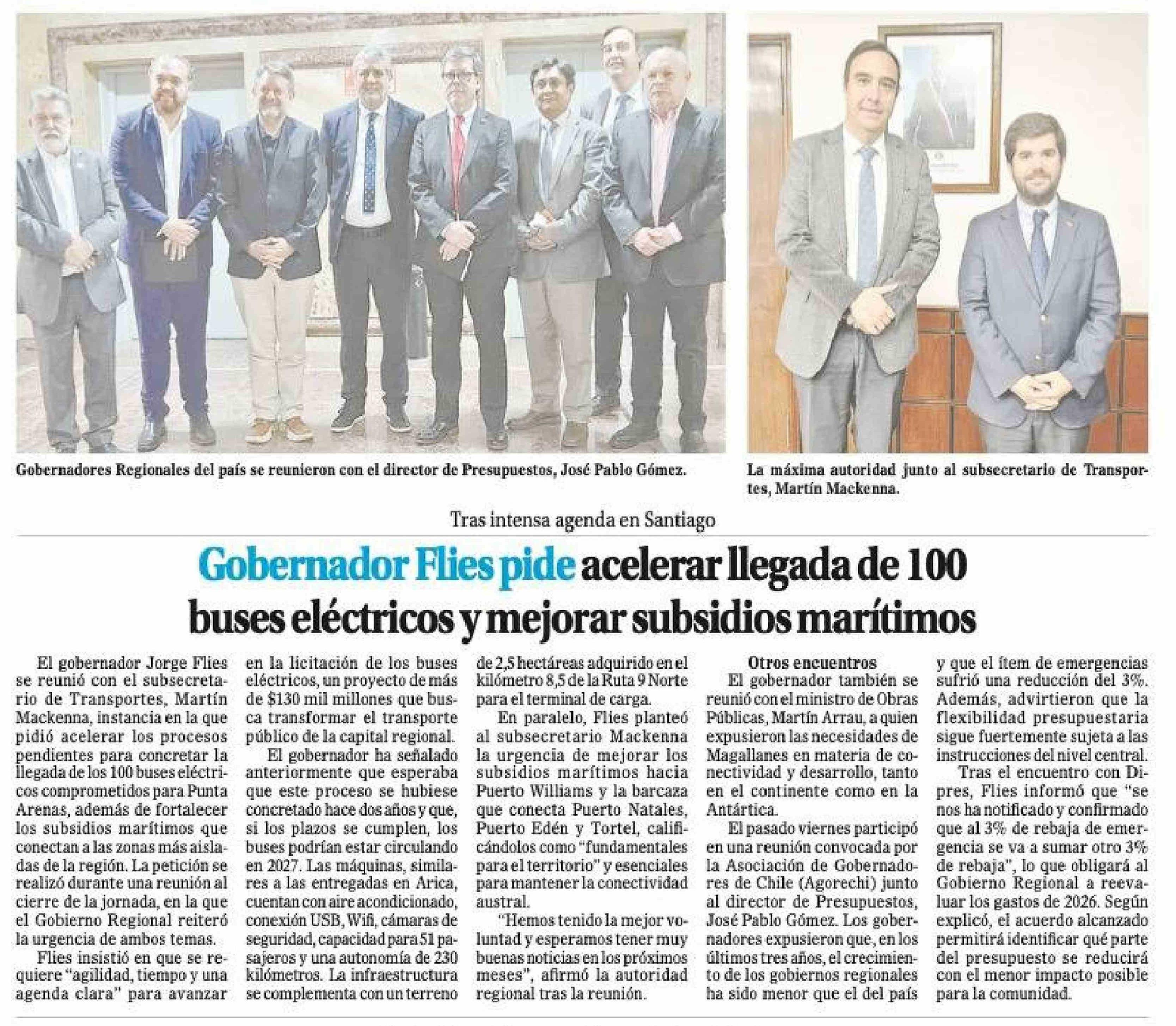 Gobernador Flies pide acelerar llegada de 100 buses eléctricos y mejorar subsidios marítimos 22-03-2026 El Magallanes |