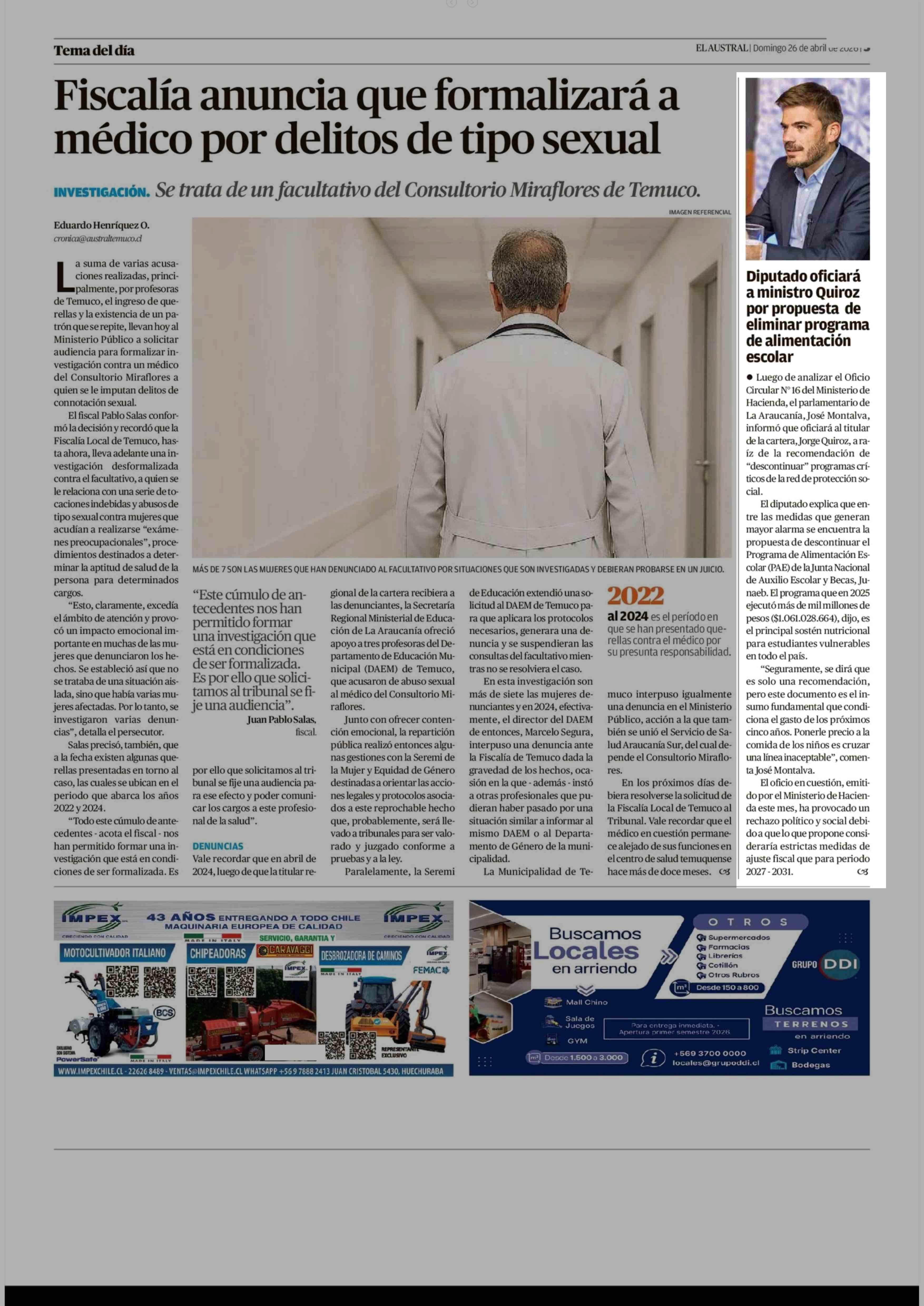 Diputado oficiará aministro Quiroz por propuesta de eliminar programa de alimentación escolar 26-04-2026 El Austral de la Araucanía |