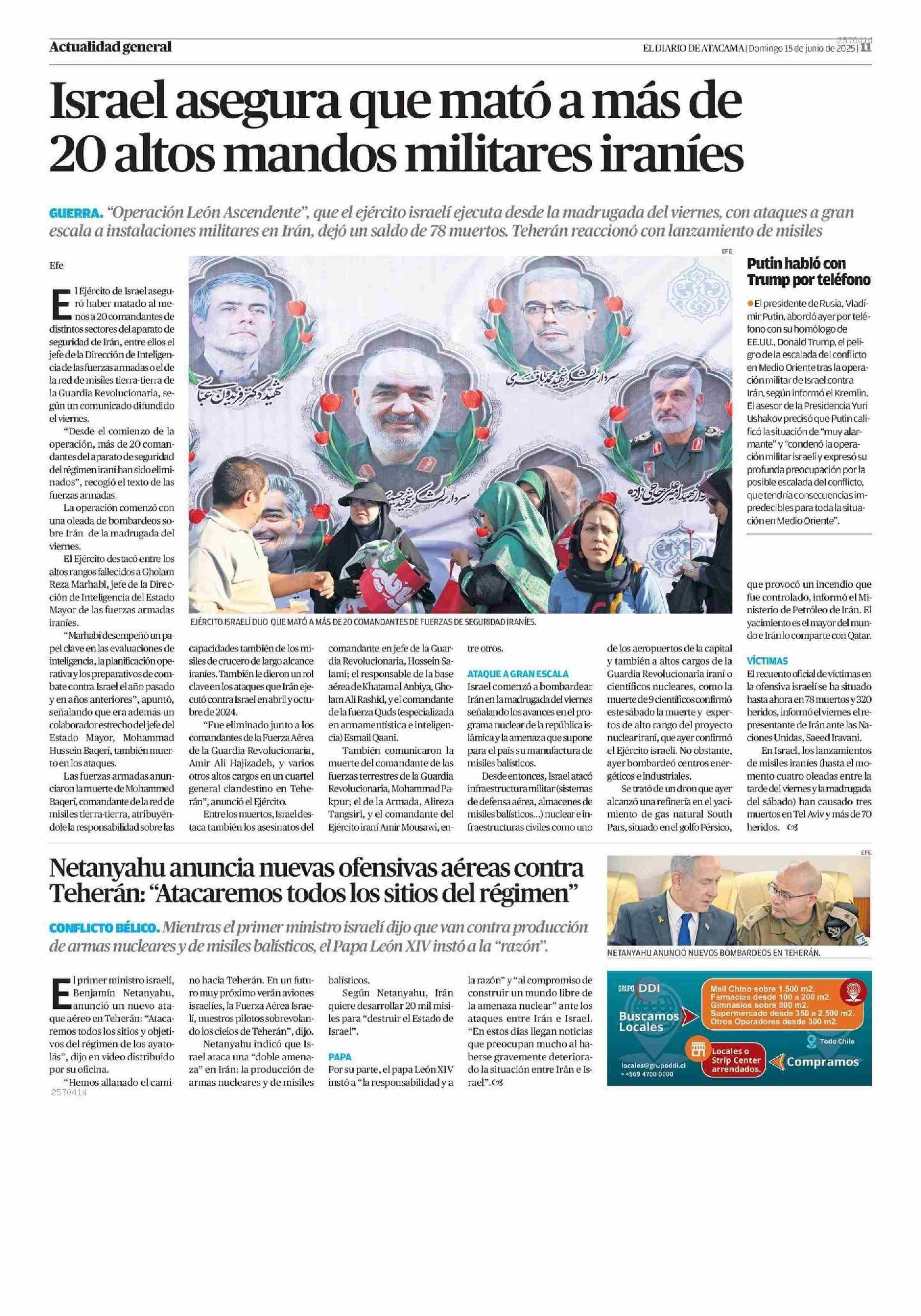 Netanyahu anuncia nuevas ofensivas aéreas contra Teherán: "Atacaremos todos los sitios del régimen" 15-06-2025 El Diario de Atacama |