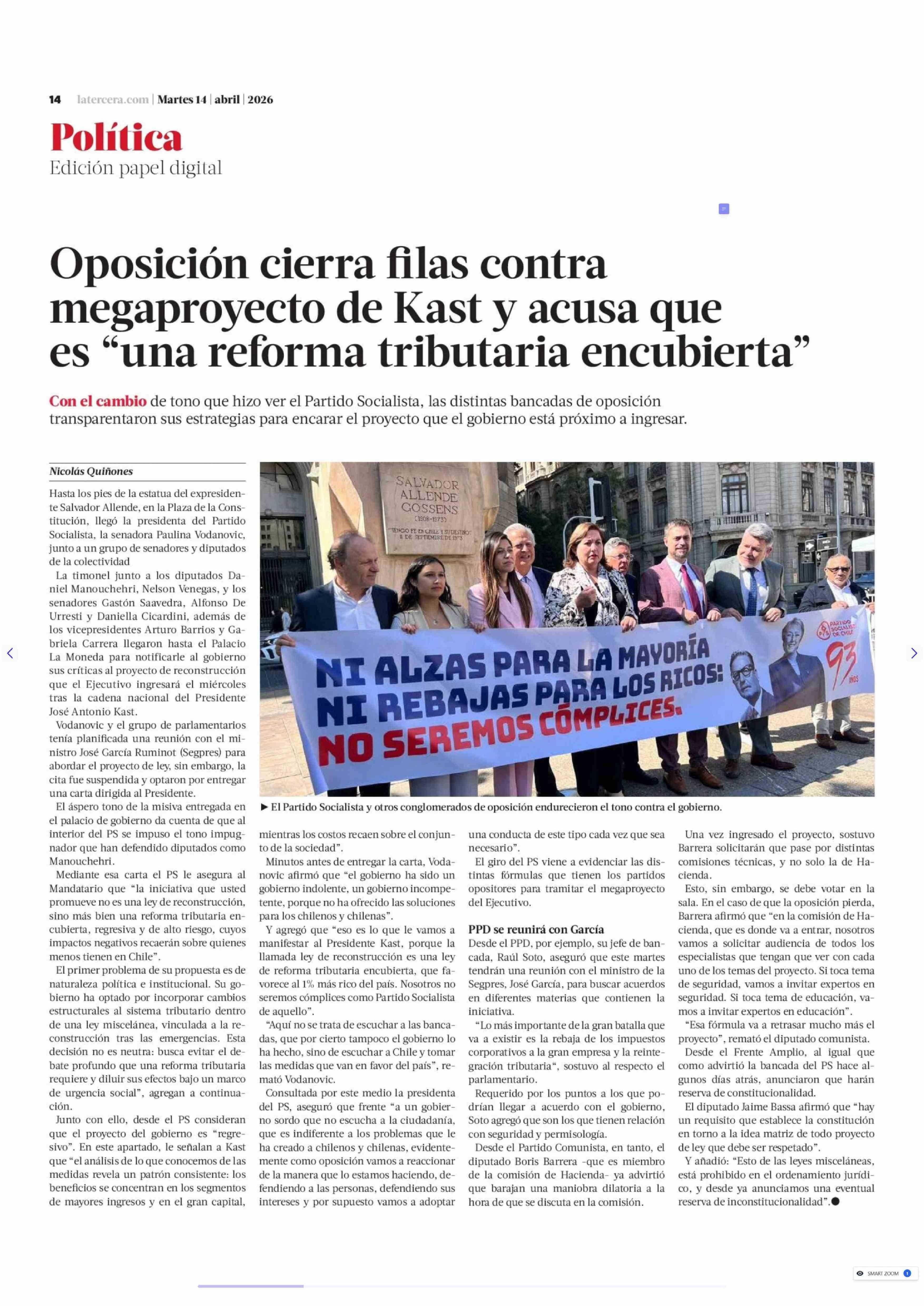 Oposición cierra filas contra megaproyecto de Kast y acusa que es "una reforma tributaria encubierta" 14-04-2026 La Tercera |