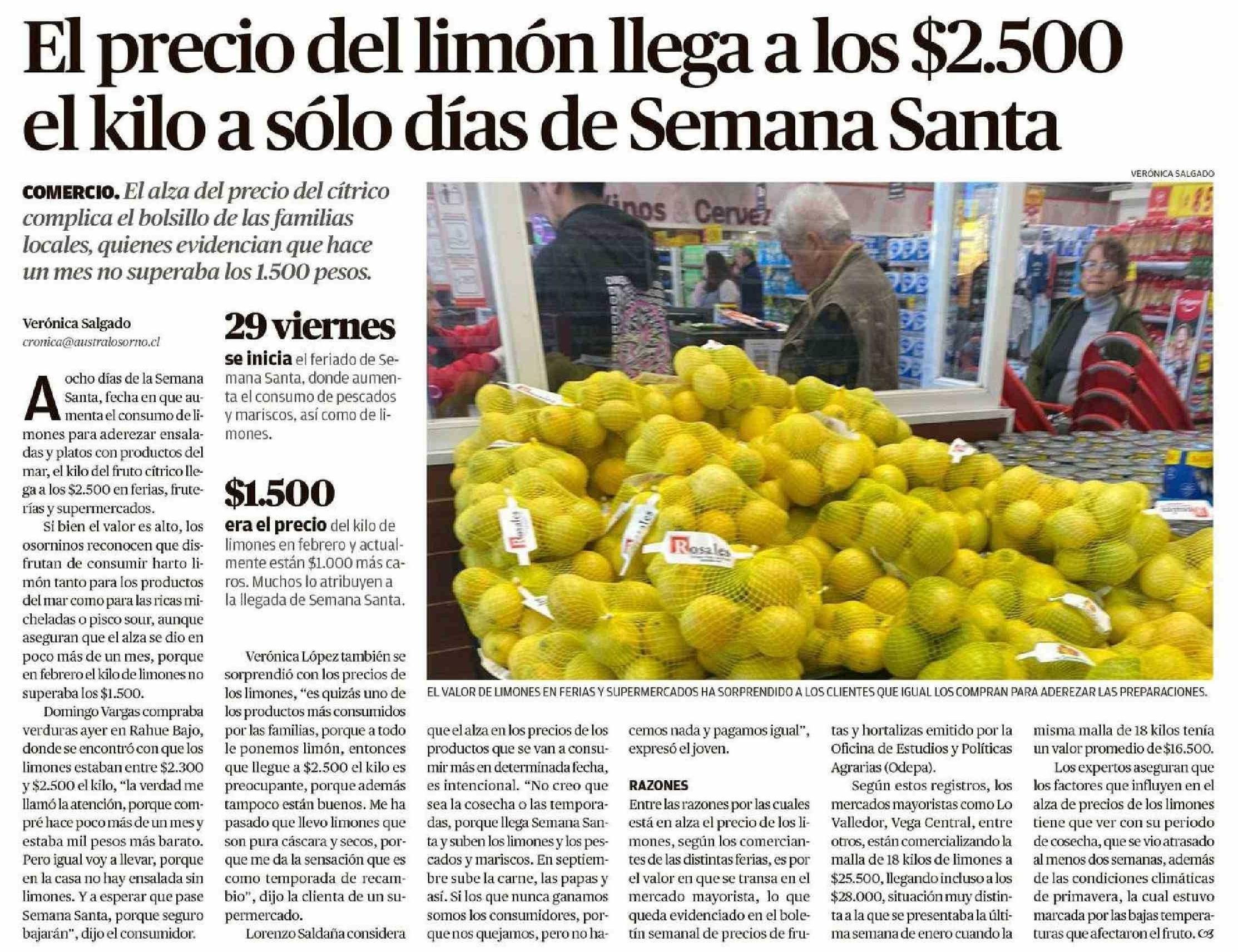 El precio del limón llega a los $2.500 el kilo a sólo días de Semana Santa 22-03-2024 El Austral de Osorno |