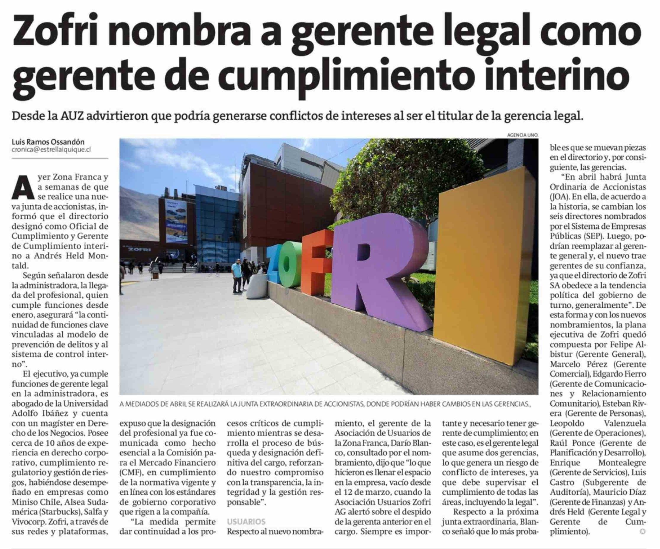Título: Zofri nombra a gerente legal como gerente de cumplimiento interino