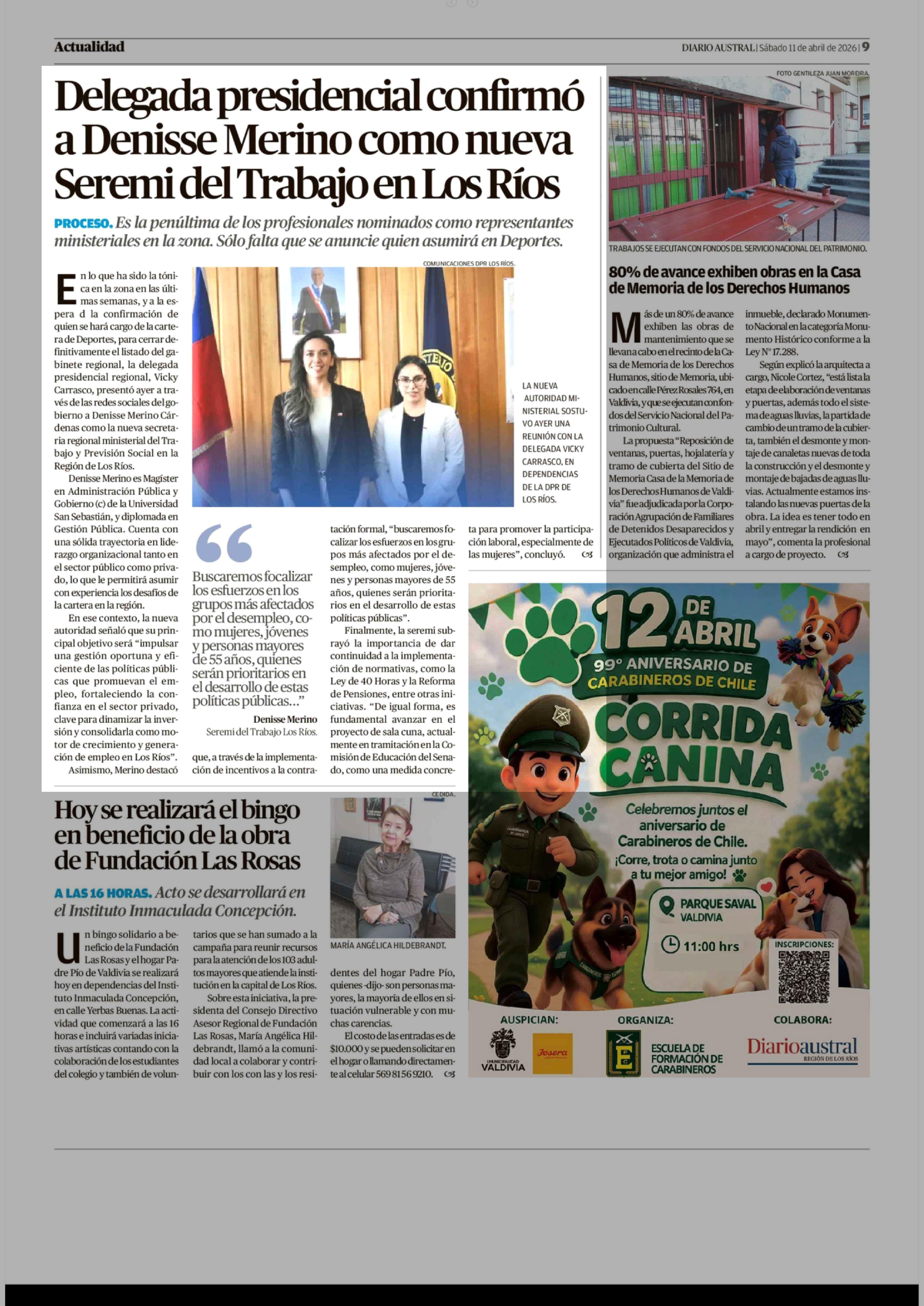 Delegada presidencial confirmó a Denisse Merino como nueva Seremi del Trabajo en Los Ríos 11-04-2026 Diario Austral Región de Los Ríos |