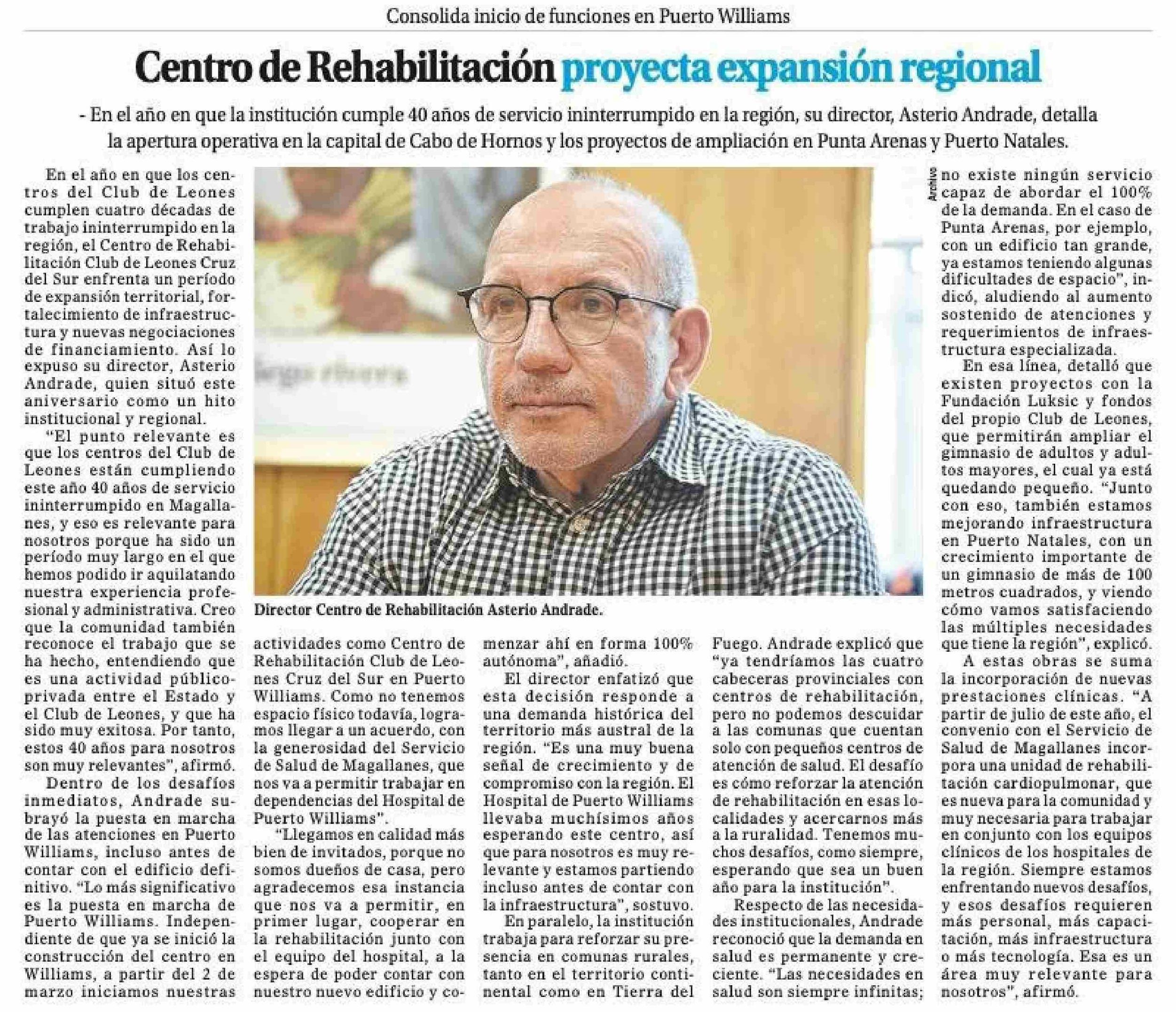 Centro de Rehabilitadón proyecta expansión regional 01-03-2026 El Magallanes |