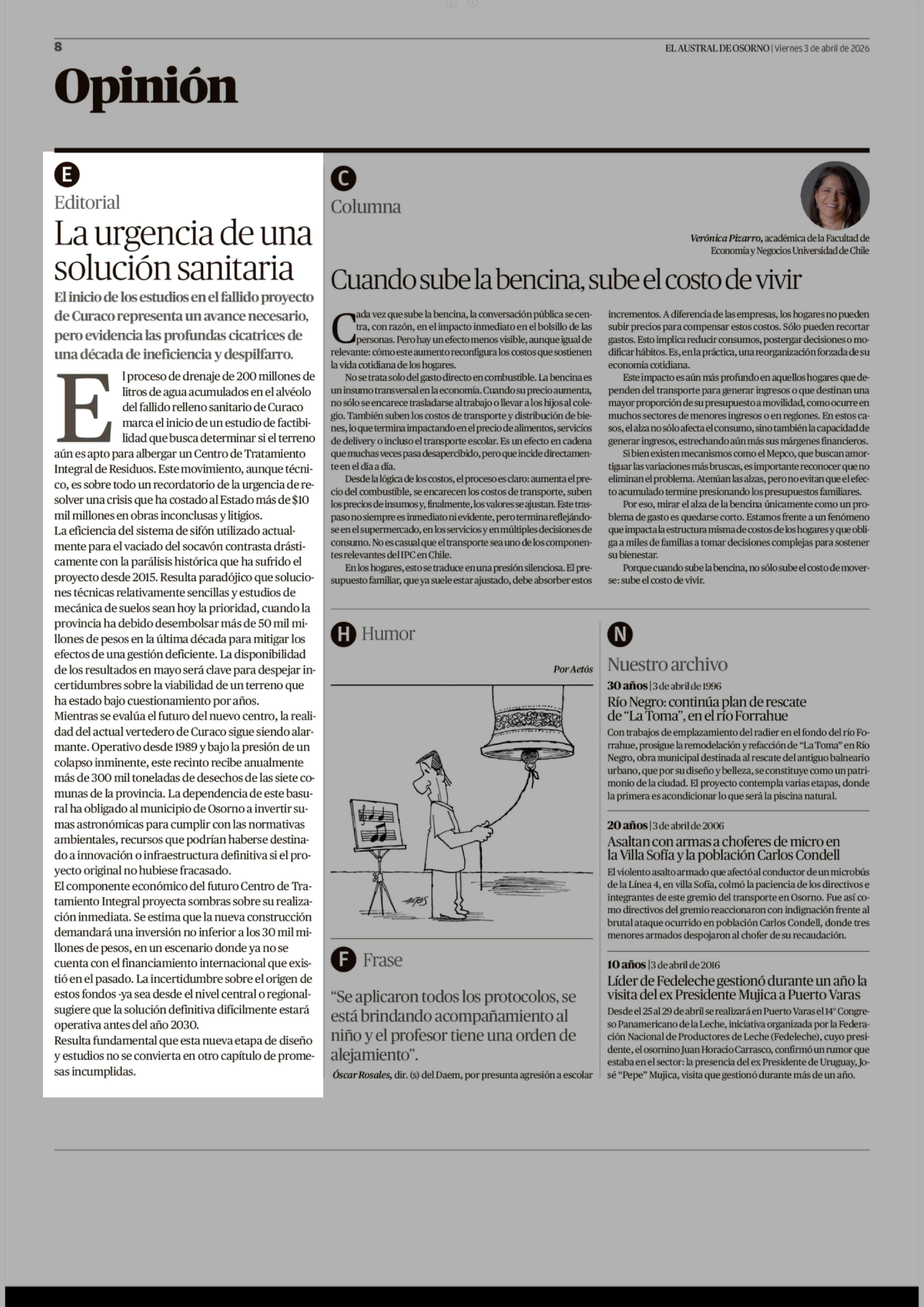 Editorial: La urgencia de una solución sanitaria 03-04-2026 El Austral de Osorno |