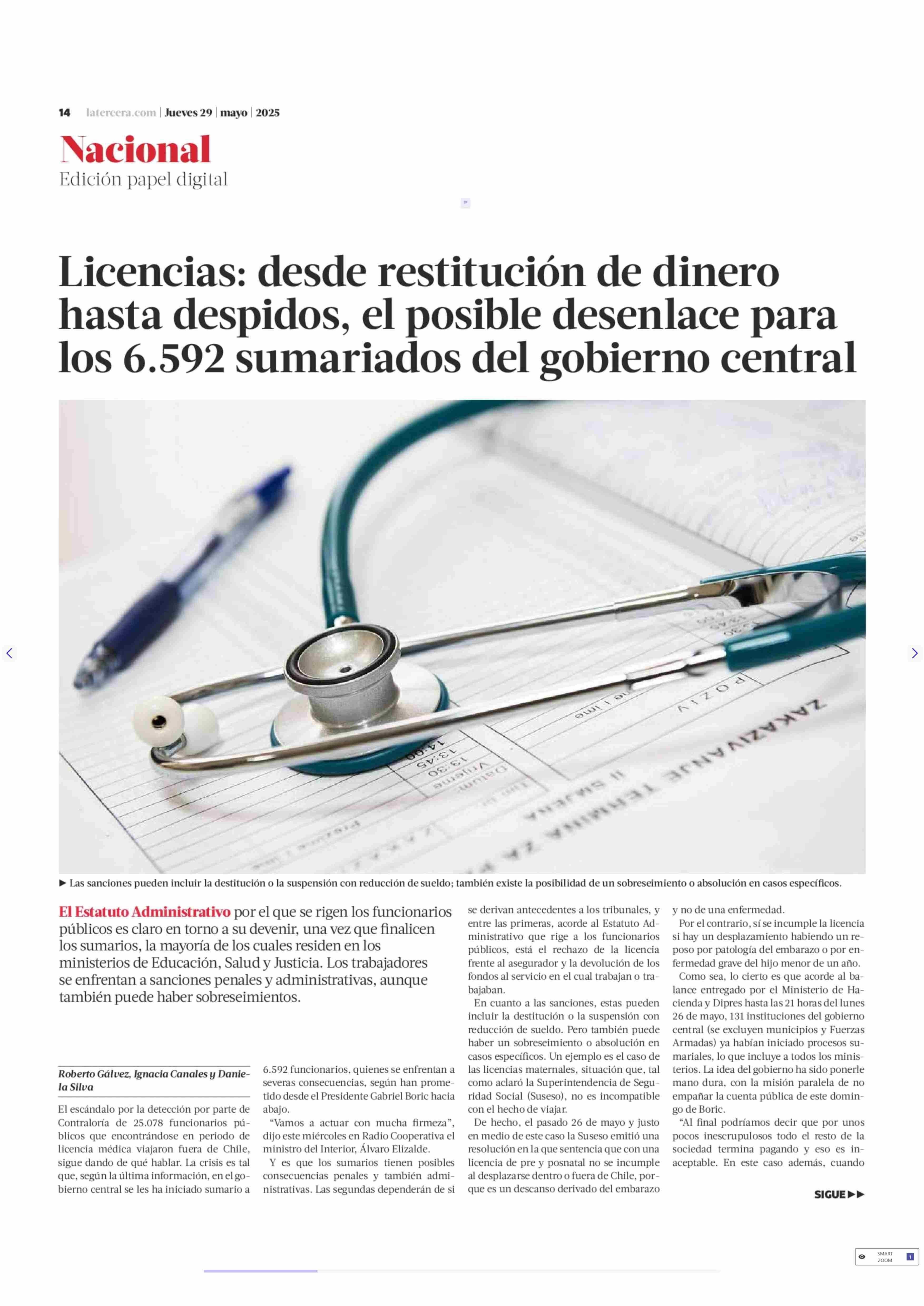 Licencias: desde restitución de dinero hasta despidos, el posible desenlace para los 6.592 sumariados del gobierno central 29-05-2025 La Tercera |