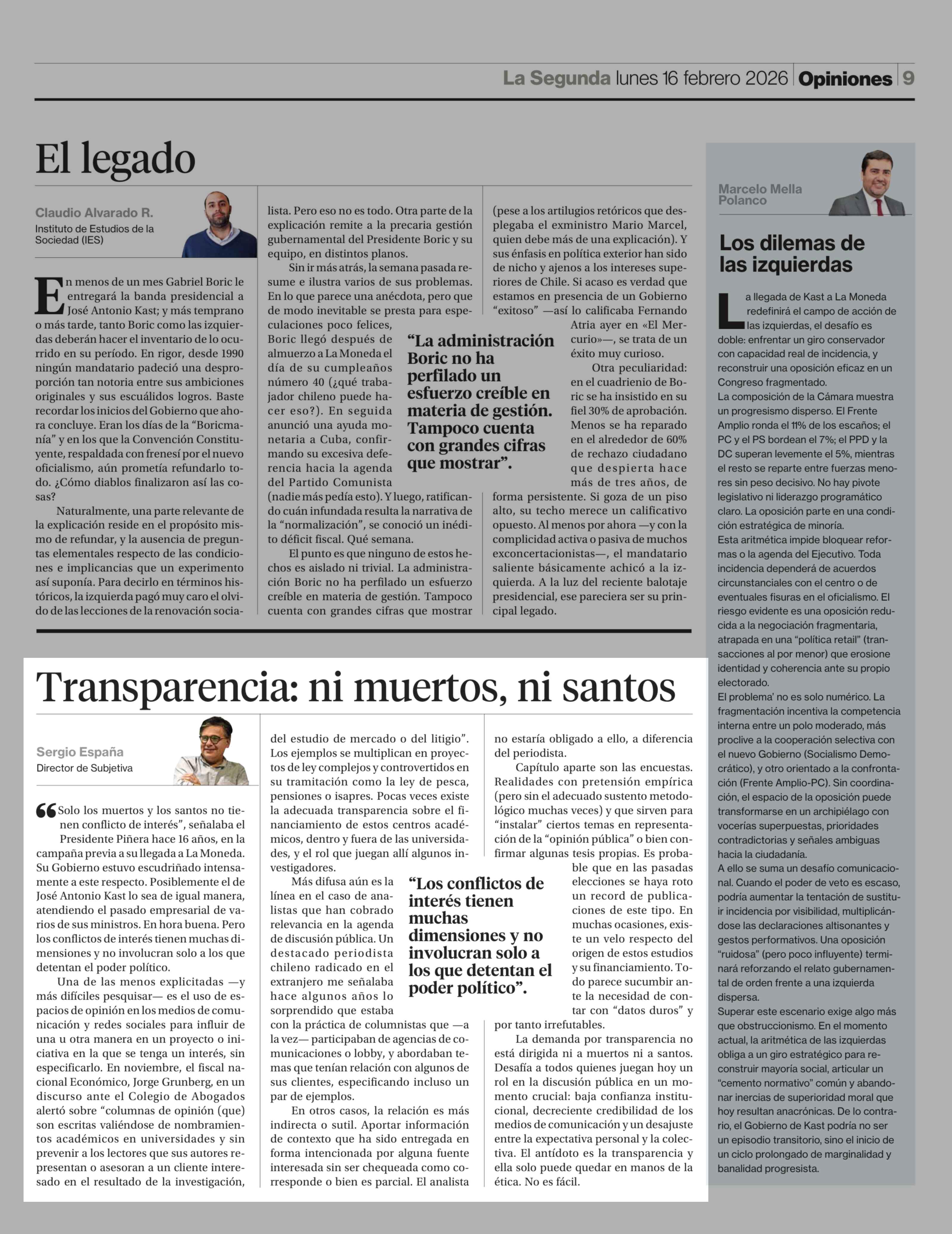 Columnas de Opinión: Transparencia: ni muertos, ni santos 16-02-2026 La Segunda |